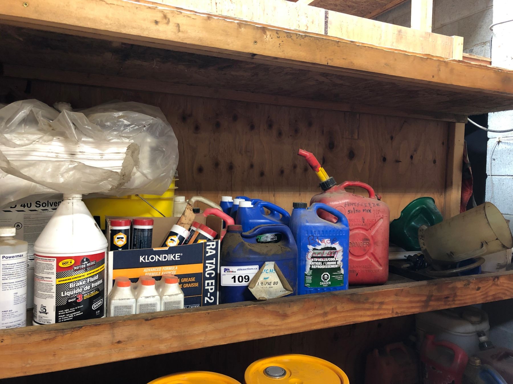 SHELF LOT OF ASSORTED FLUIDS: ANTI-FREEZE, BRAKE FLUID, SPILL PADS & MORE
