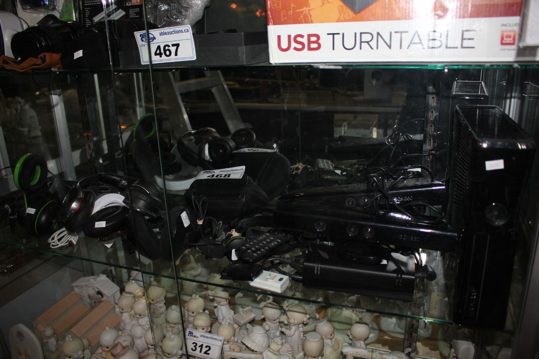 SHELF LOT OF ASSORTED GAMING HEADSETS, XBOX 360 & MORE