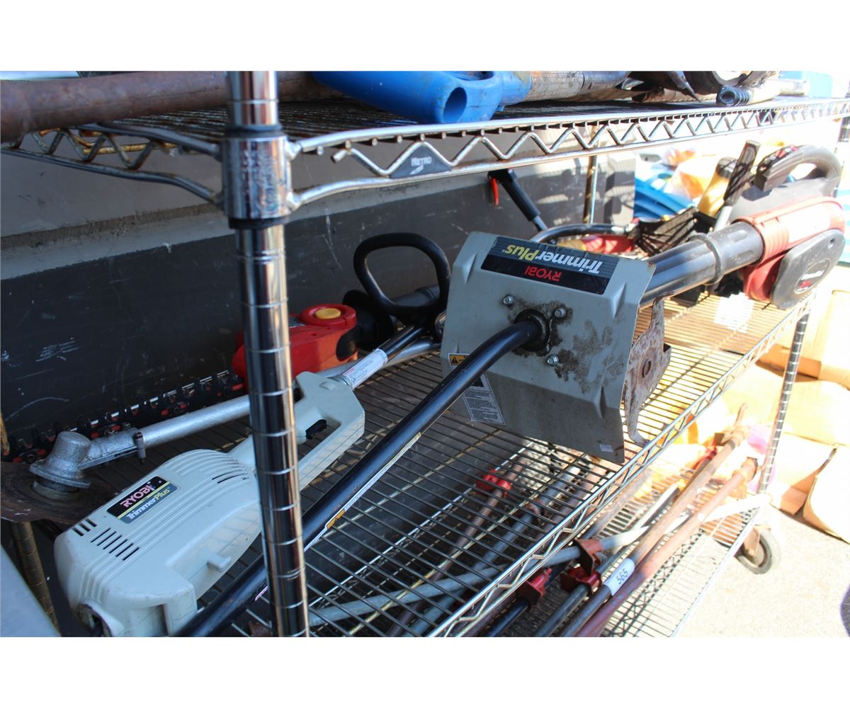 SHELF LOT OF ASSORTED GARDEN TOOLS; GAS BLOWER, TRIMMER, WEED EATER, ETC