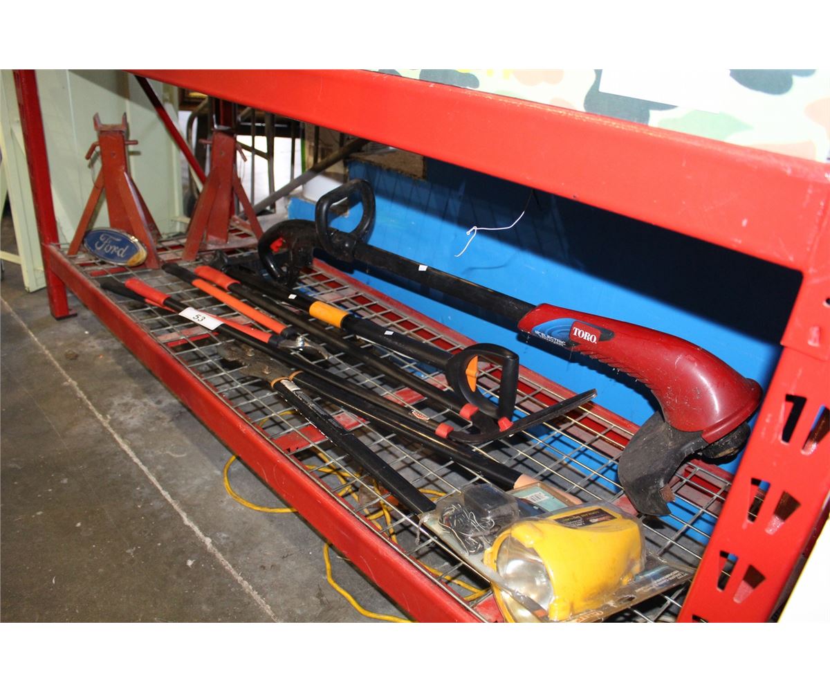 SHELF LOT OF ASSORTED GARDENING TOOLS; TORRO ELECTRIC WEED EATER, PRUNERS, JACK STANDS, ETC