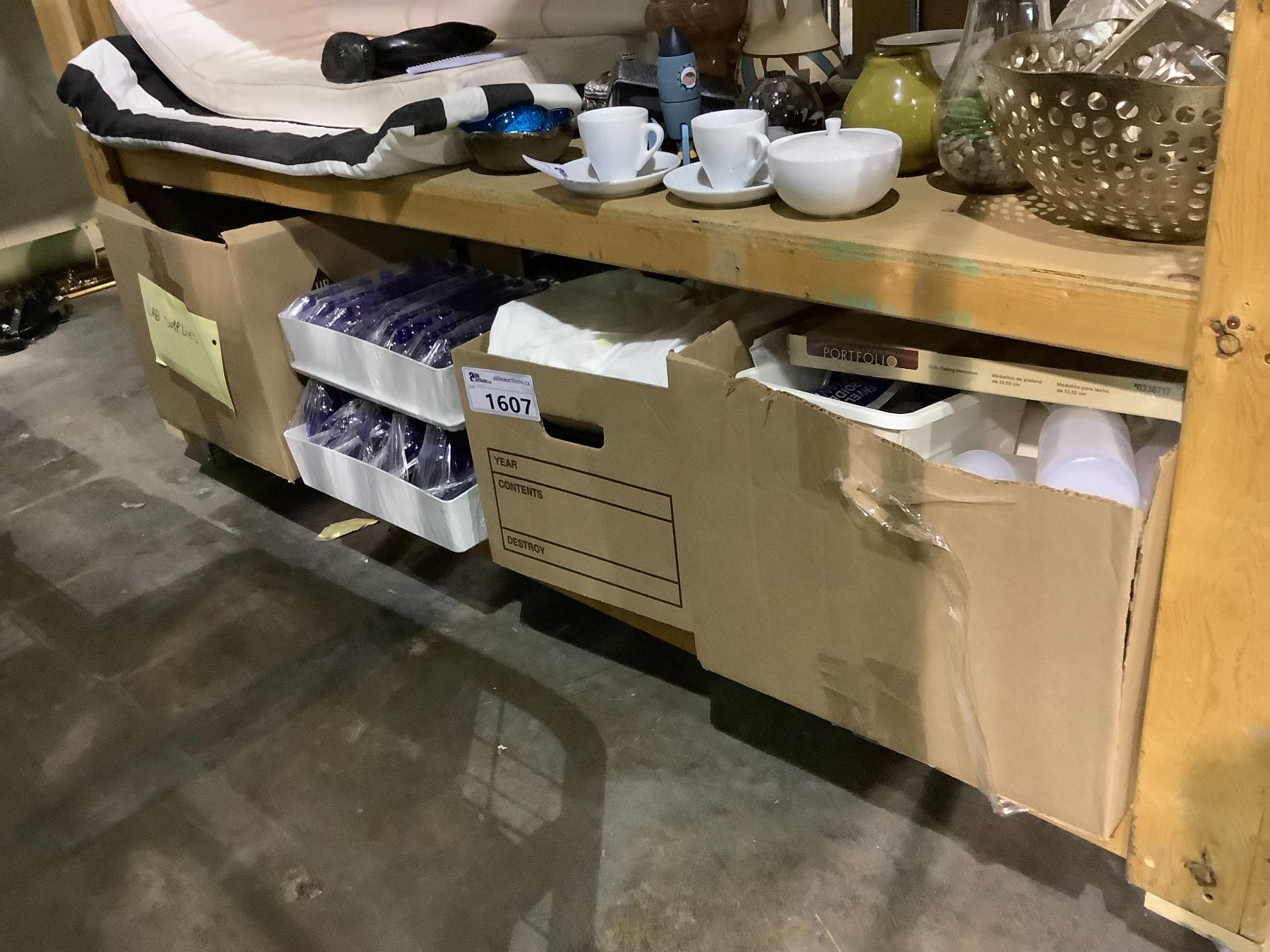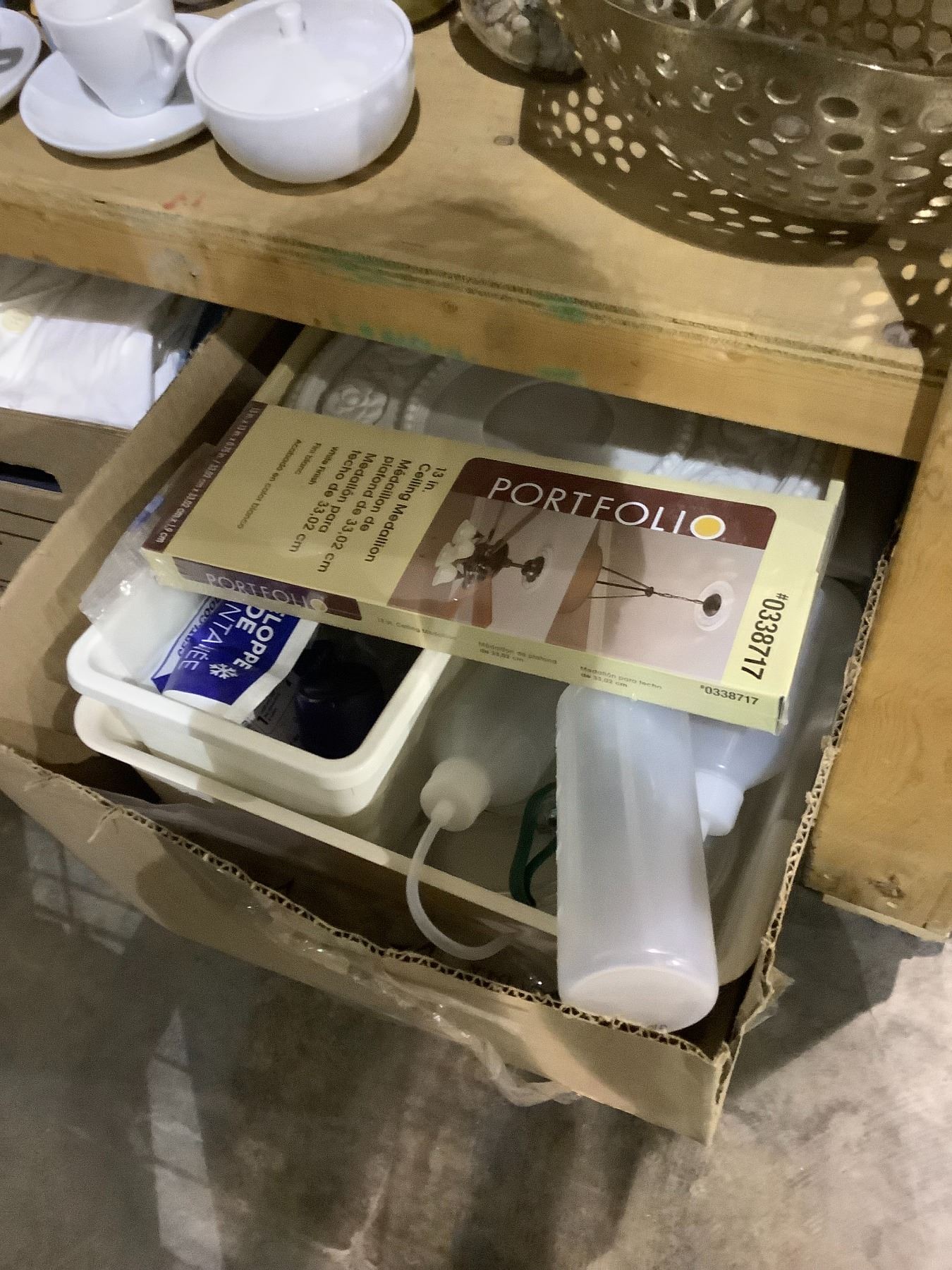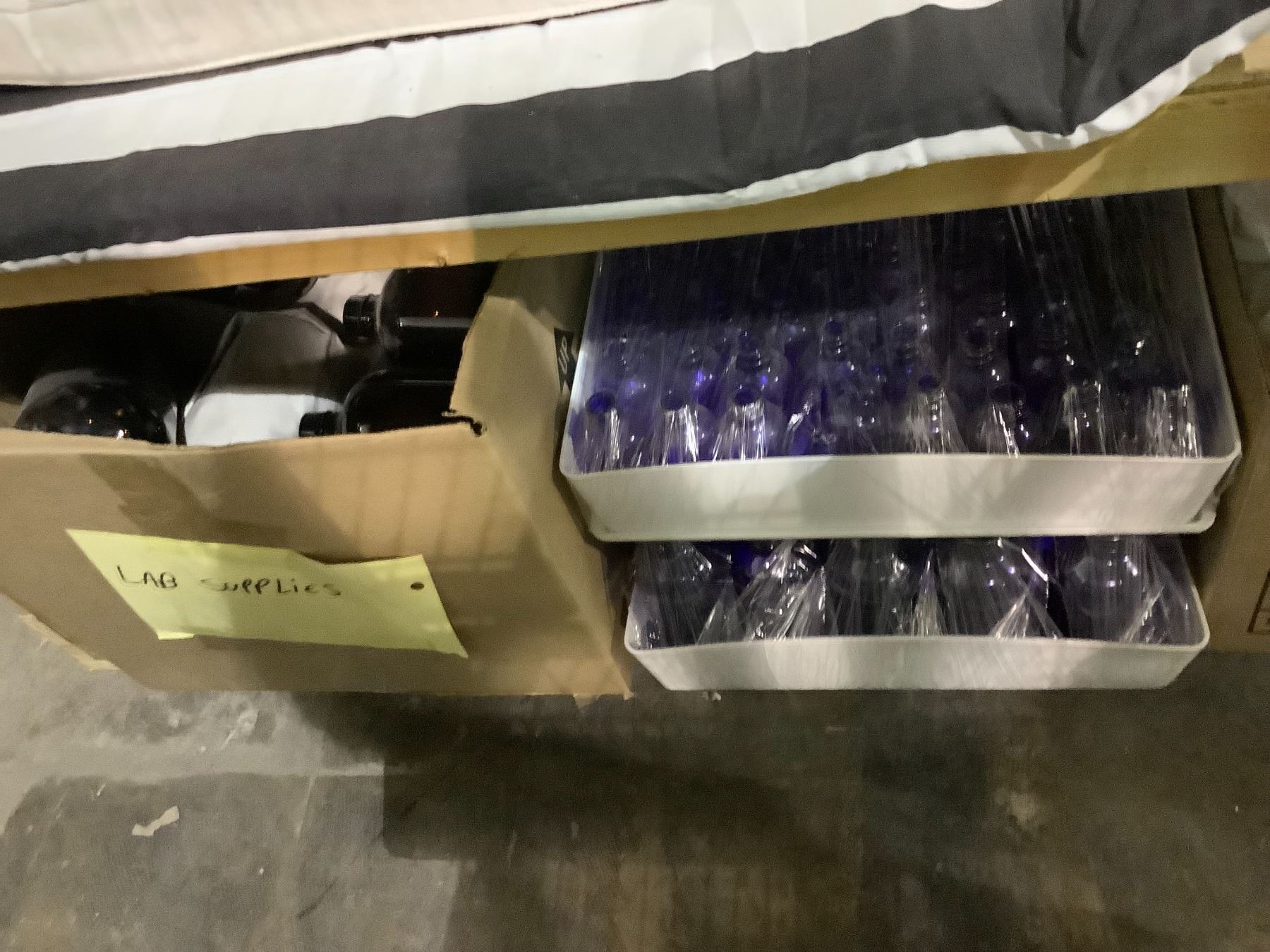SHELF LOT OF ASSORTED GLASS BOTTLES, COVERALLS AND MORE