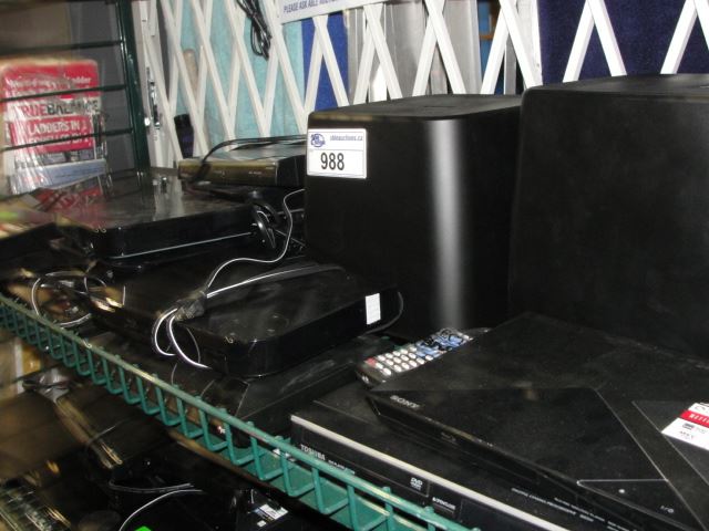 SHELF LOT OF ASSORTED HOME AUDIO ELECTRONICS; SPEAKERS, ETC