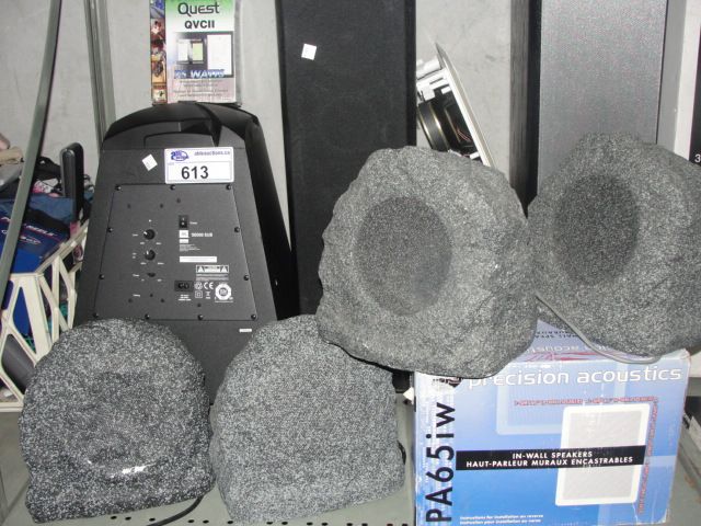 SHELF LOT OF ASSORTED HOME AUDIO SPEAKERS; OUTDOOR ROCK SHAPED SPEAKERS AND IN WALL SPEAKERS