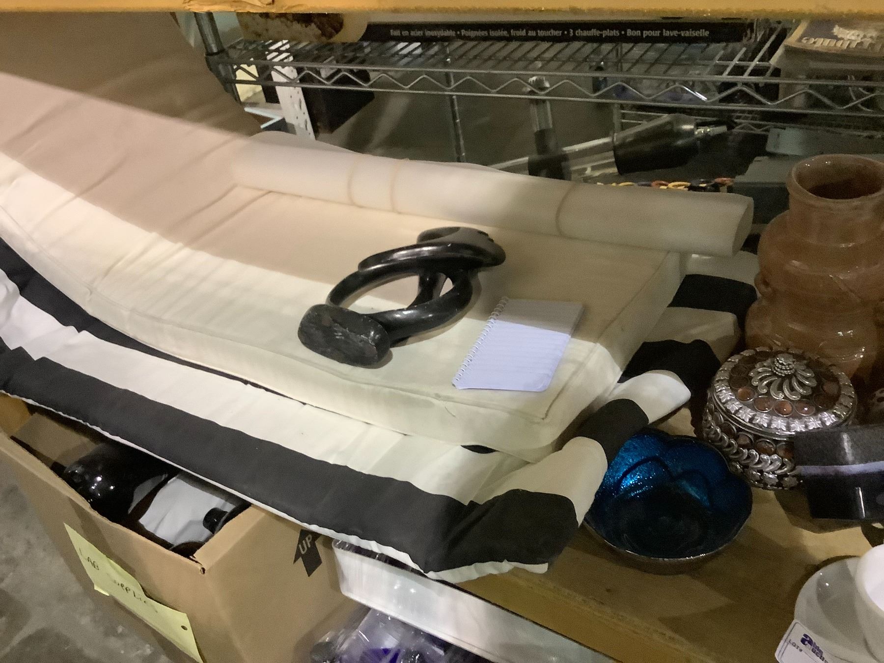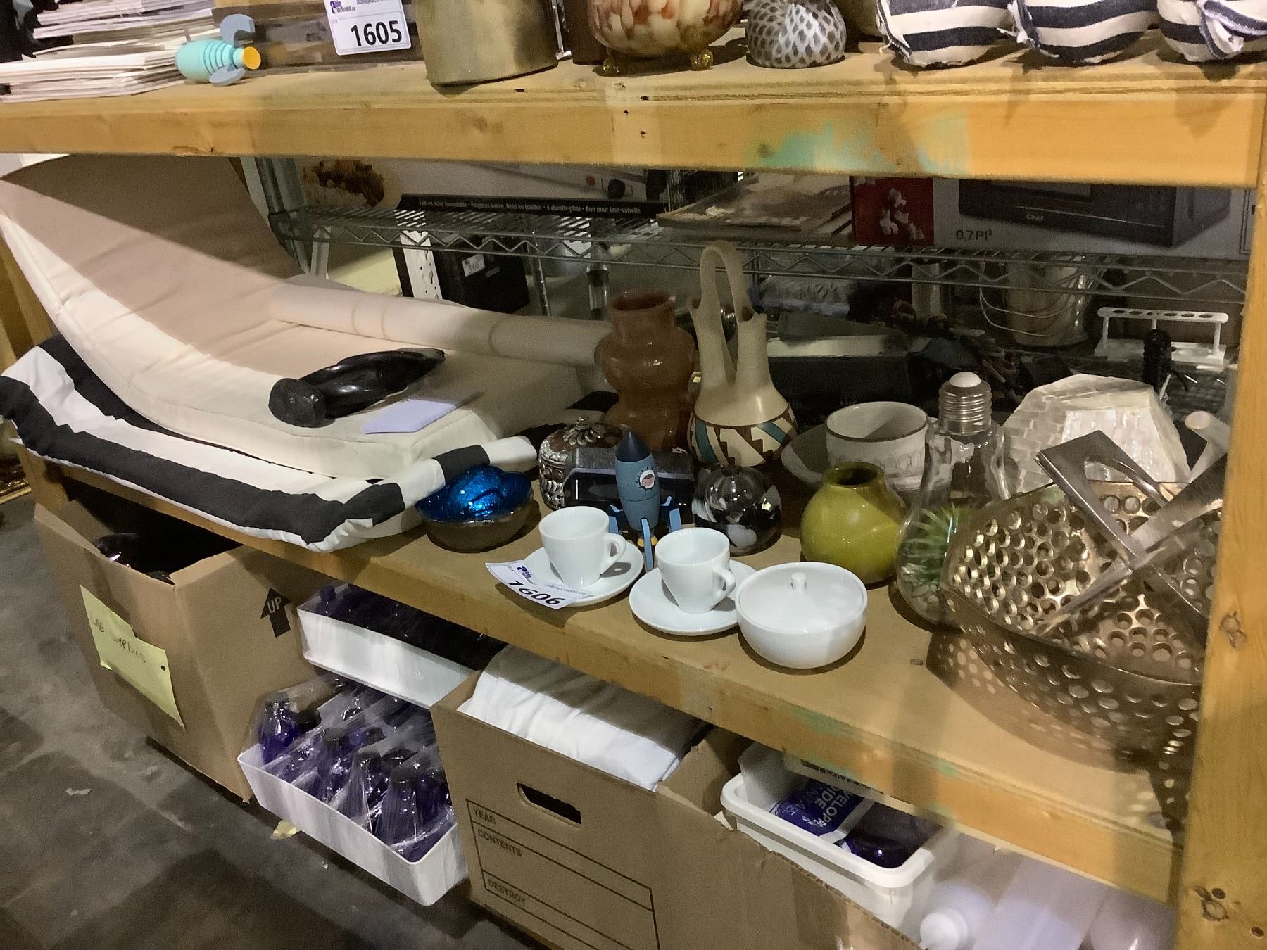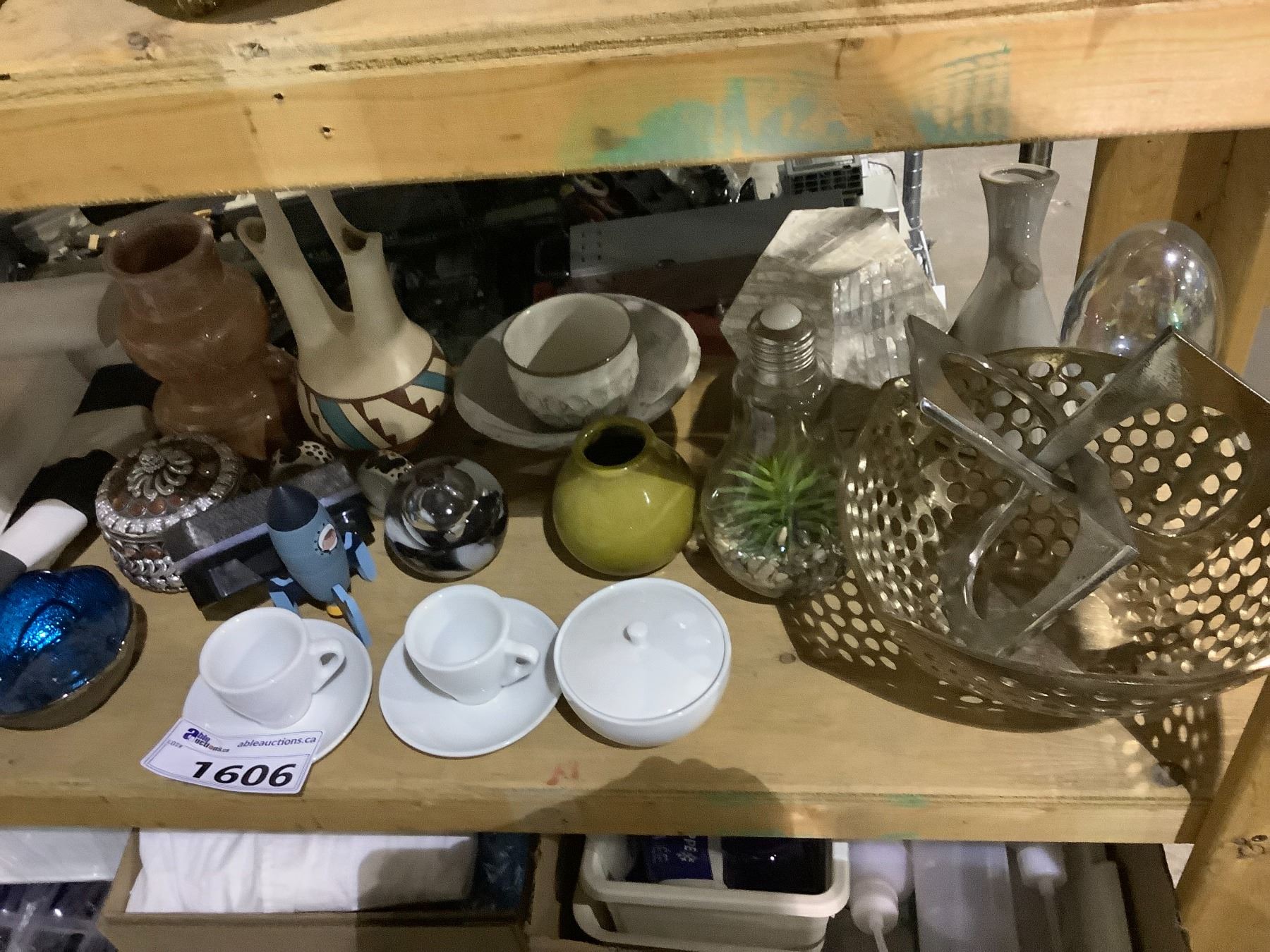 SHELF LOT OF ASSORTED HOME DECOR, DISHES AND CUSHIONS