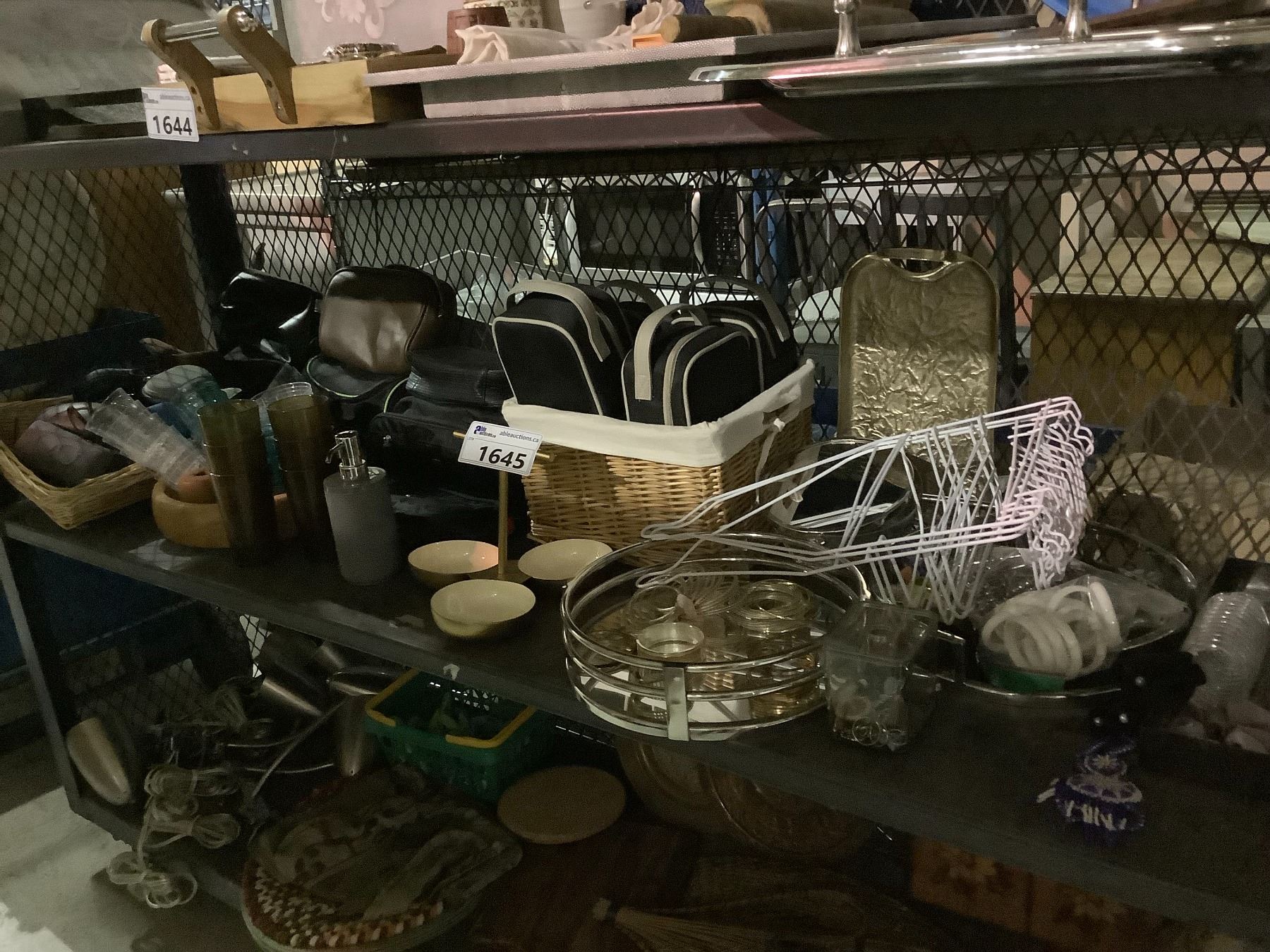 SHELF LOT OF ASSORTED HOME DECOR, GLASSES, AND BAGS