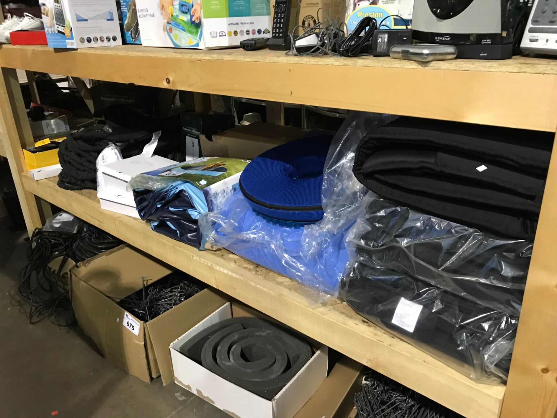 SHELF LOT OF ASSORTED HOSE, CUSHIONS, SHOES, VACUUM & MORE