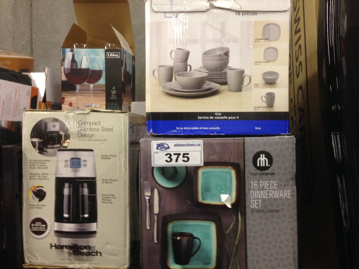 SHELF LOT OF ASSORTED HOUSEHOLD ITEMS INCLUDING HOMETRENDS DINNERWARE SET, SEALER, TRASSIMO, YOUTH GOLF SET ETC.