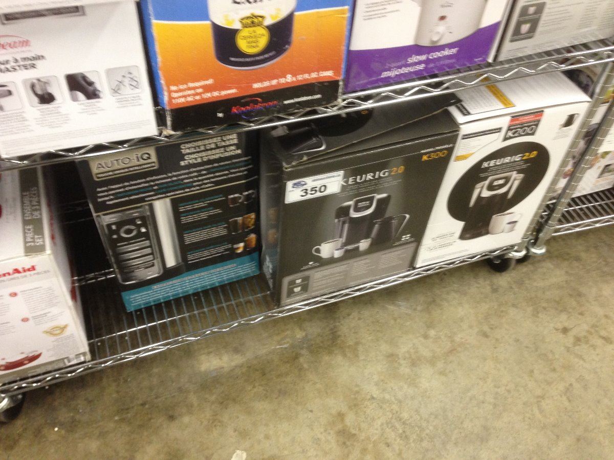 SHELF LOT OF ASSORTED HOUSEHOLD ITEMS INCLUDING KEURIG, STONEWARE SET, ETC.