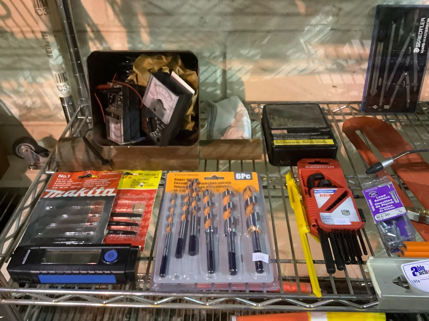 SHELF LOT OF ASSORTED ITEMS INCLUDING; AIR LINE WITH DELUXE AIR BLOW GUN, POWERSONIC 6 PIECE AUGUR BIT SET, CIRCULAR SAW BLADES & MORE