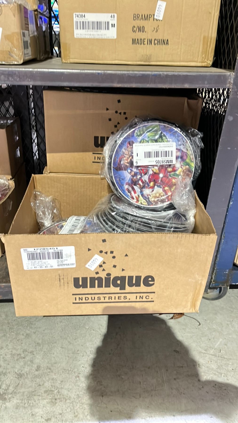 SHELF LOT OF ASSORTED ITEMS INCLUDING; DISPOSABLE PLATES, NAPKINS AND MORE