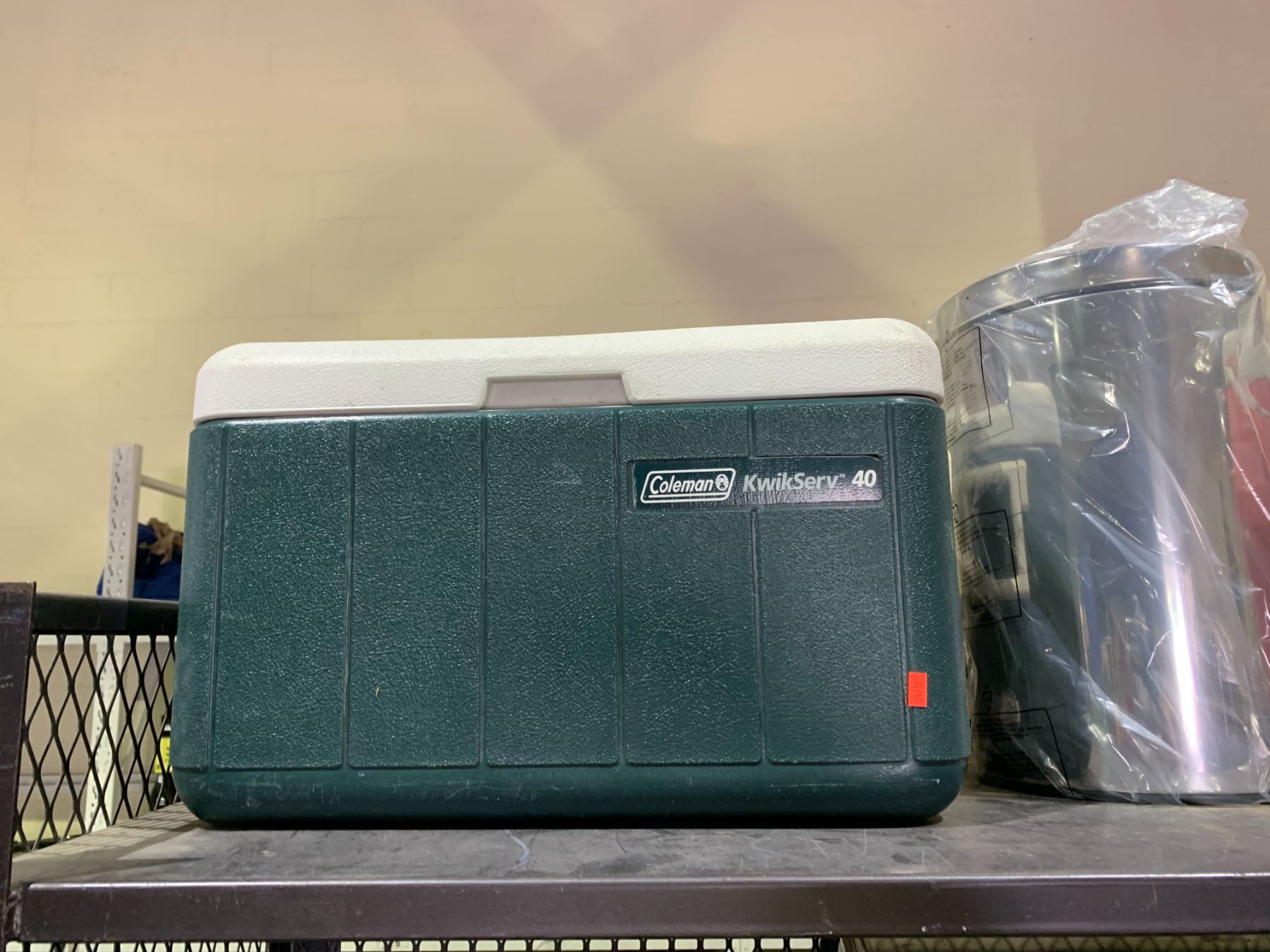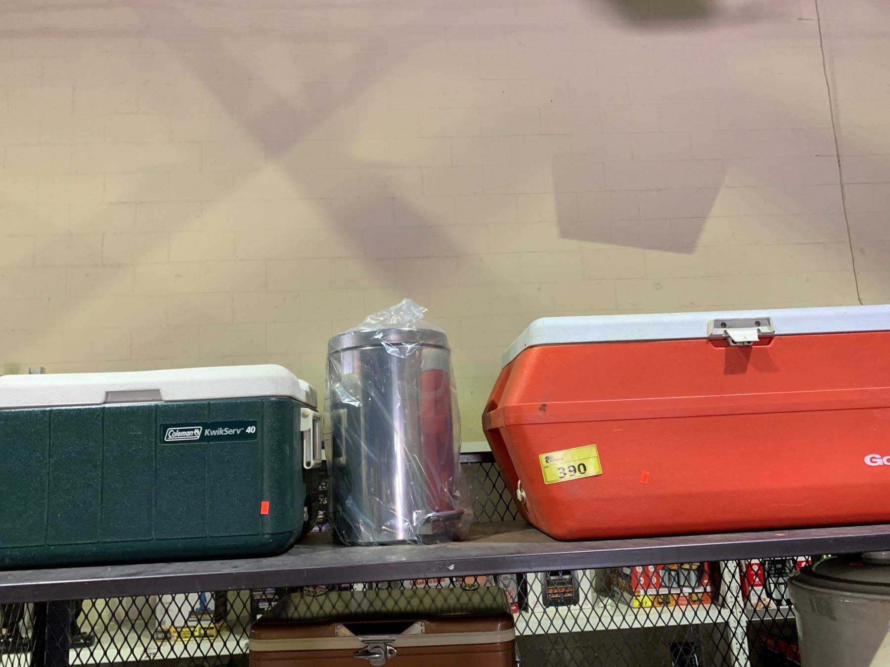 SHELF LOT OF ASSORTED ITEMS INCLUDING, GOTT 80 COOLER, COLEMAN COOLER, AND GARBAGE BIN