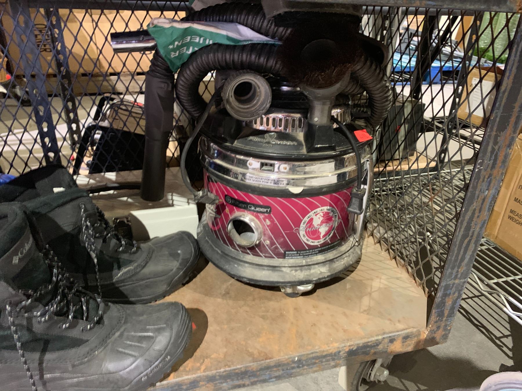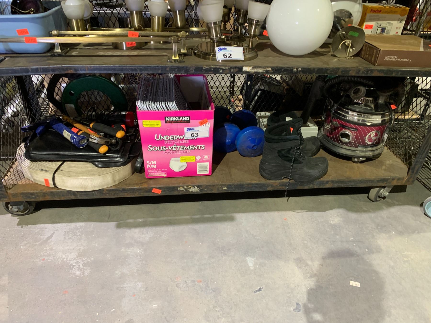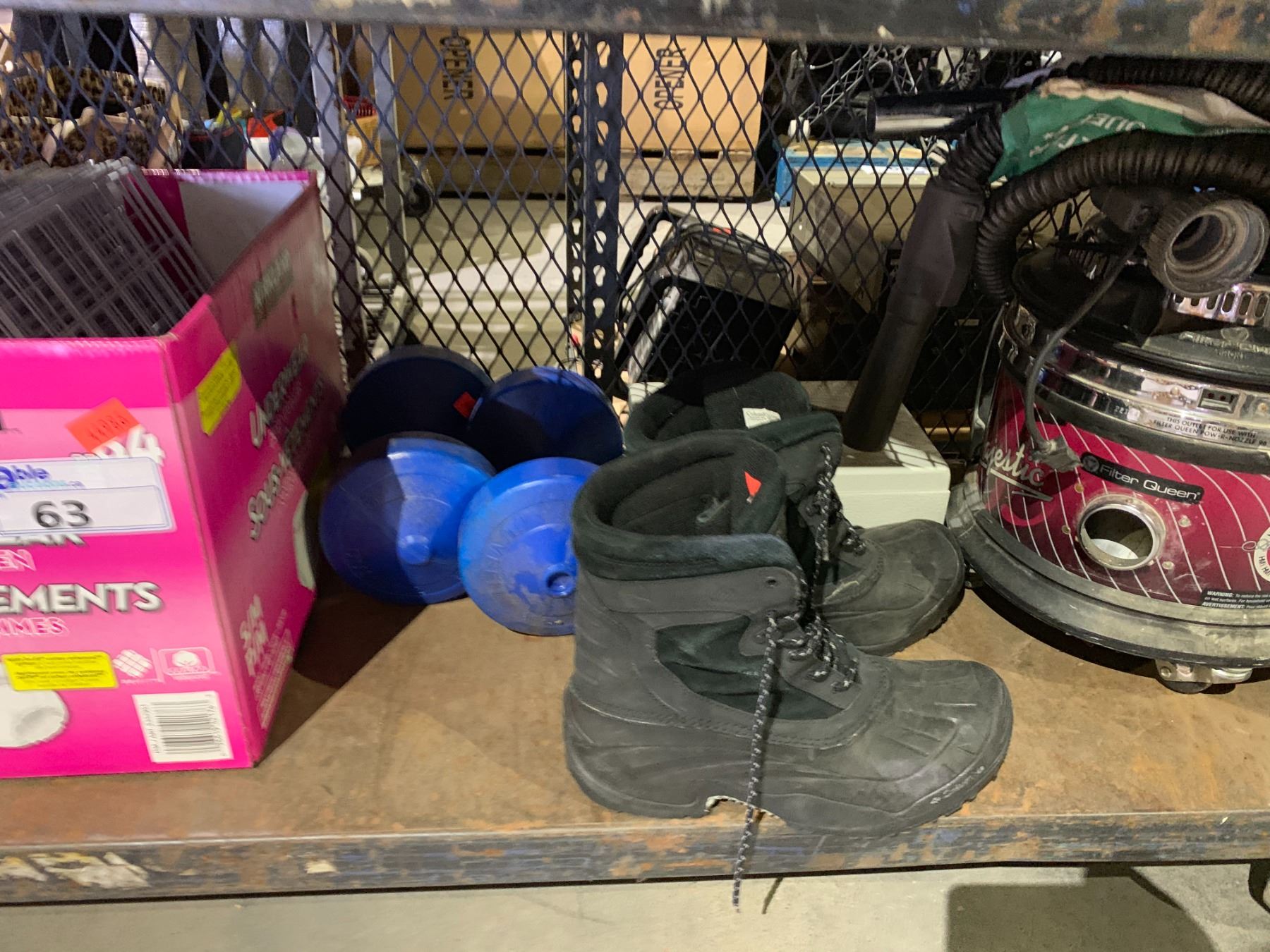 SHELF LOT OF ASSORTED ITEMS INCLUDING; HAMMERS, WEIGHTS, SIZE 11 MEN'S BOOTS AND MORE