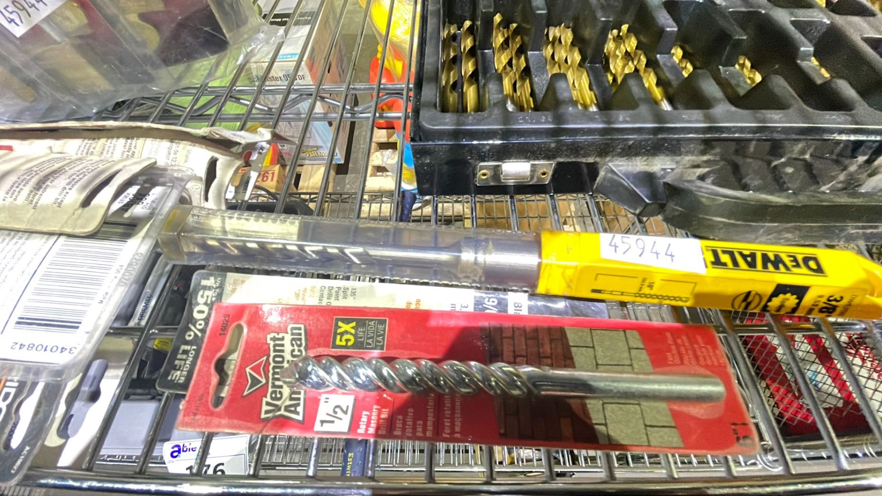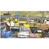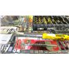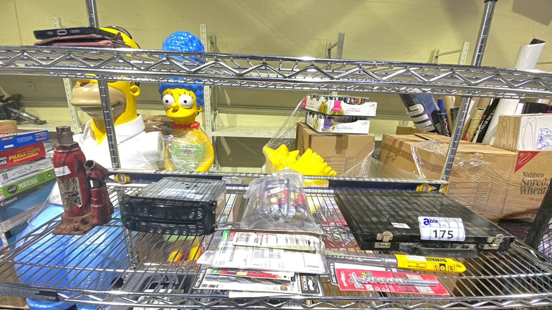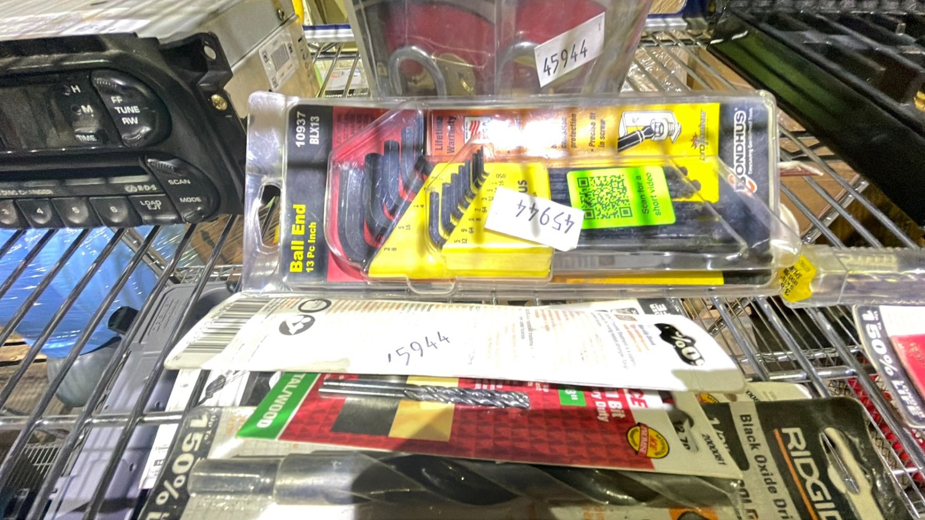 SHELF LOT OF ASSORTED ITEMS, INCLUDING: LEVELER, DRILL BIT SET, CAR RADIO, & MORE