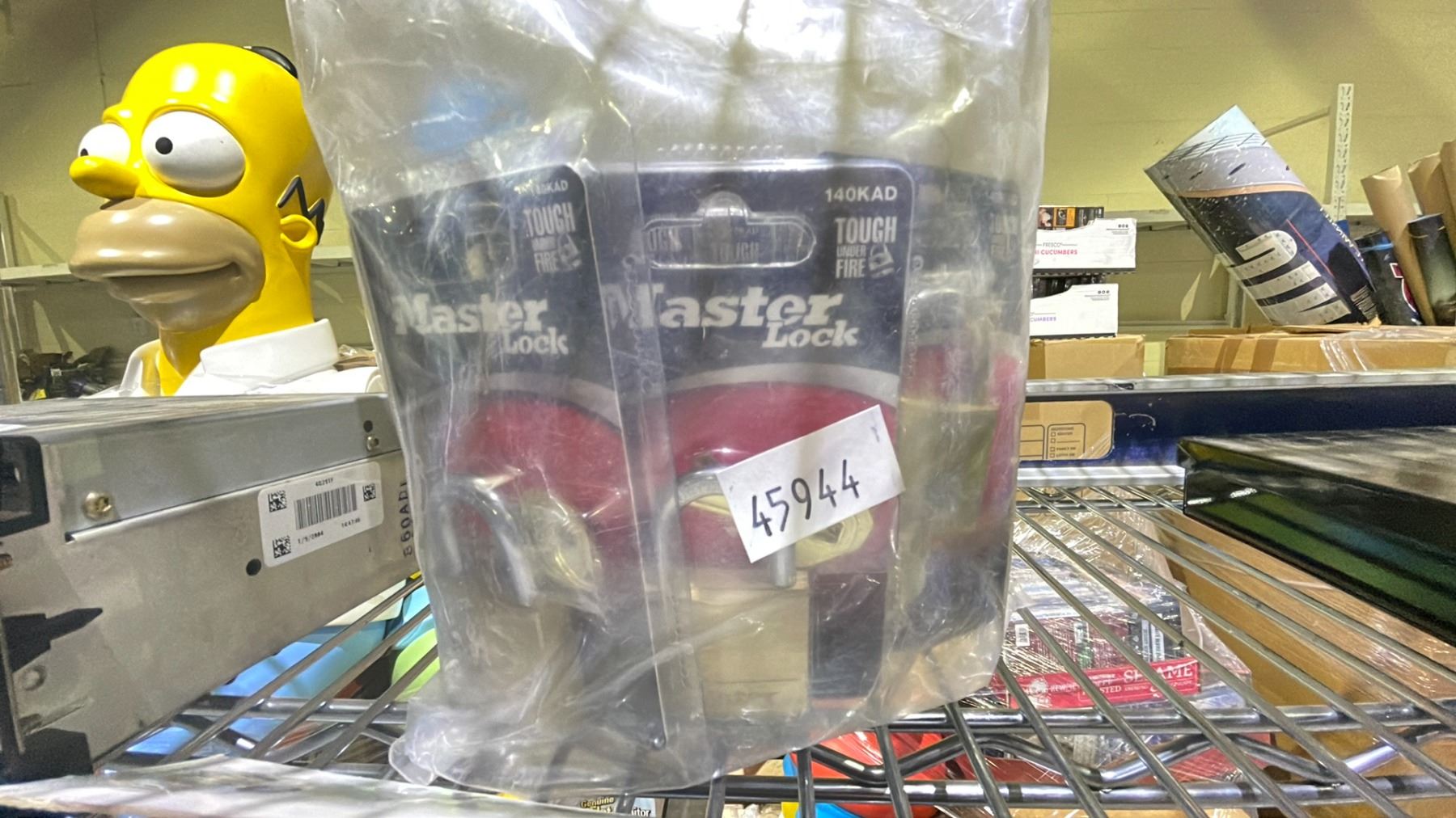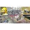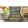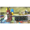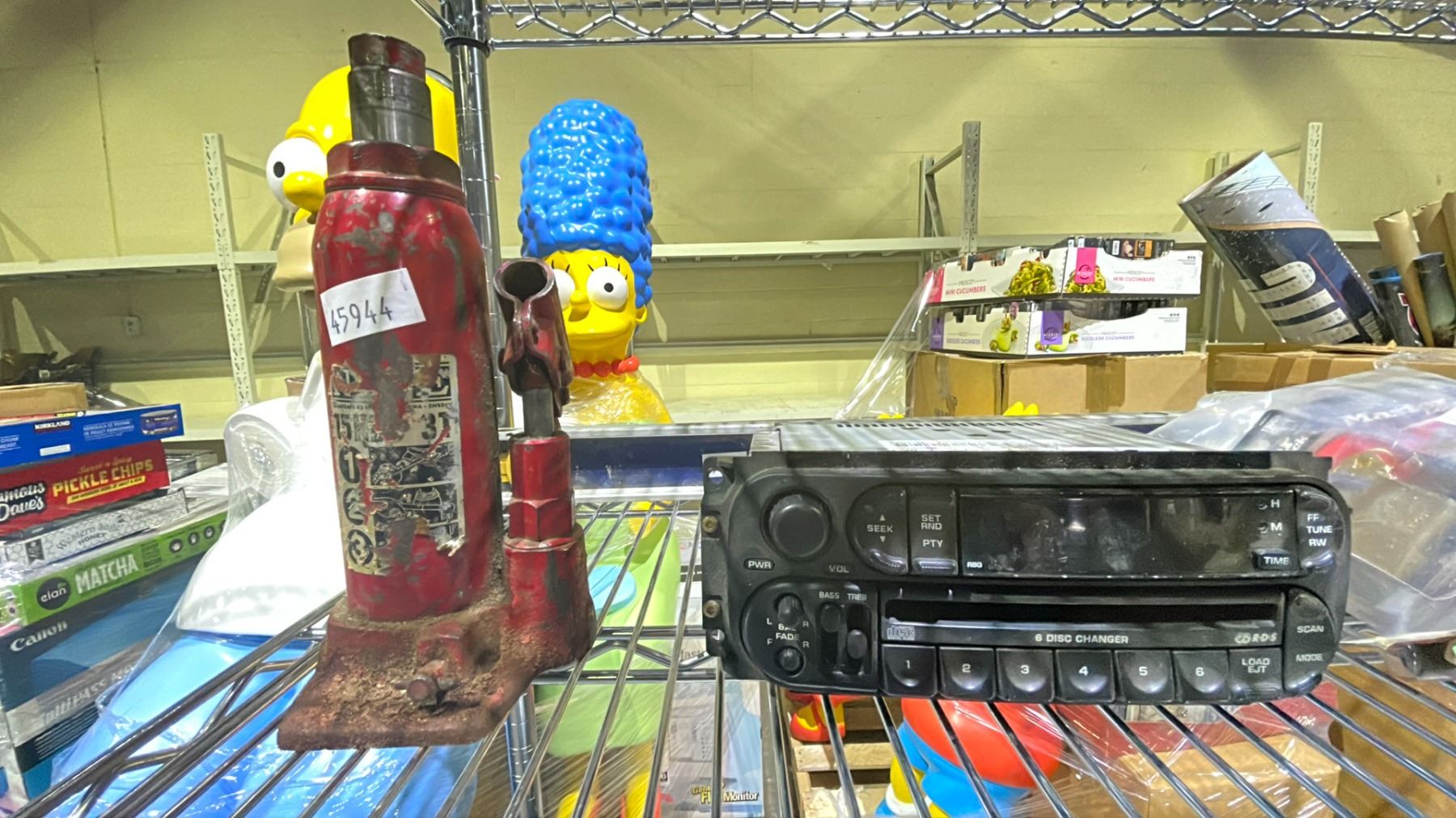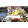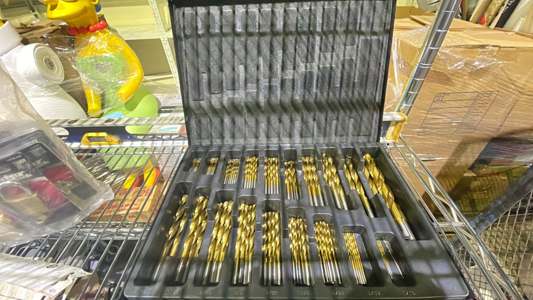 SHELF LOT OF ASSORTED ITEMS, INCLUDING: LEVELER, DRILL BIT SET, CAR RADIO, & MORE