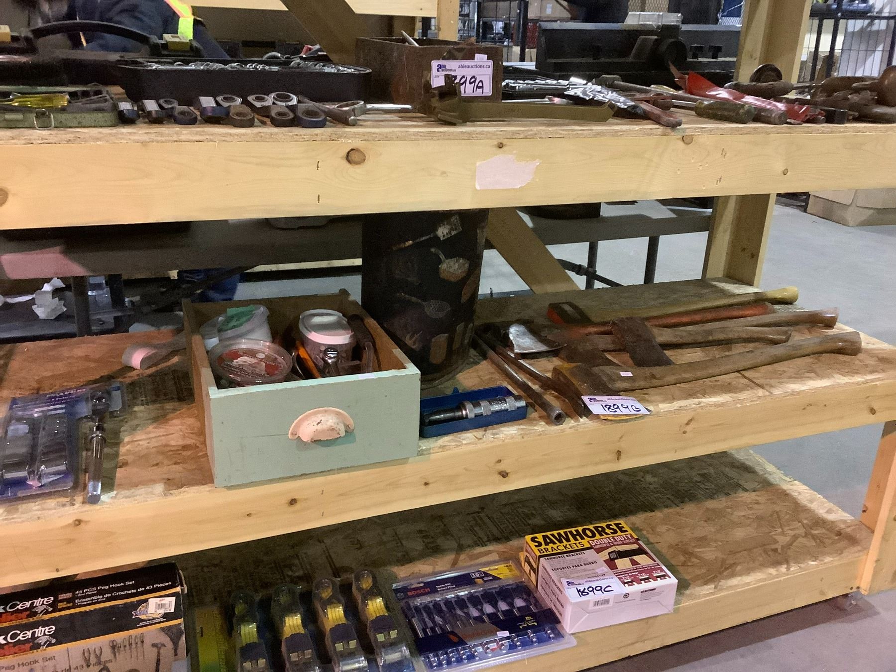 SHELF LOT OF ASSORTED ITEMS INCLUDING; MASTERCRAFT EXTENDABLE RATCHET & SOCKET SET, WESSEL IMPACT DRIVER & MORE