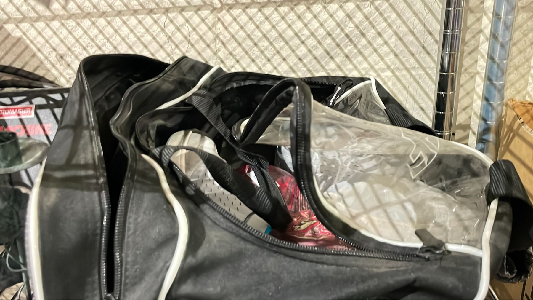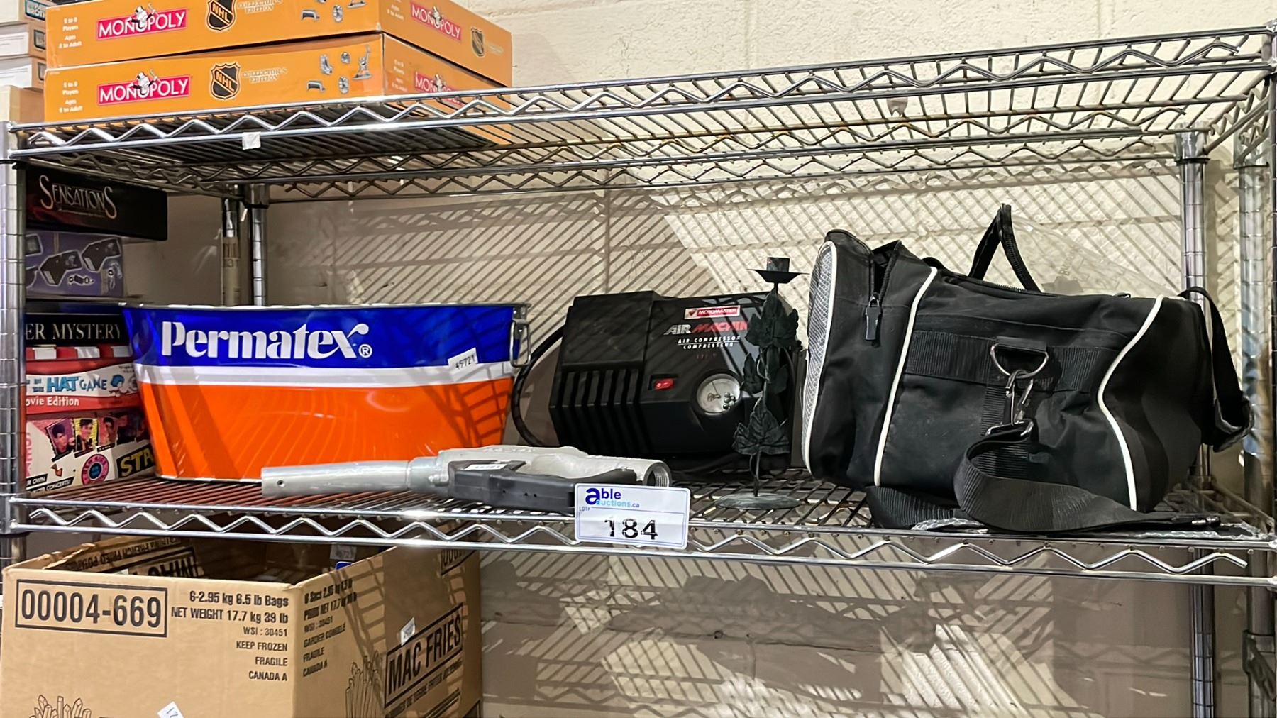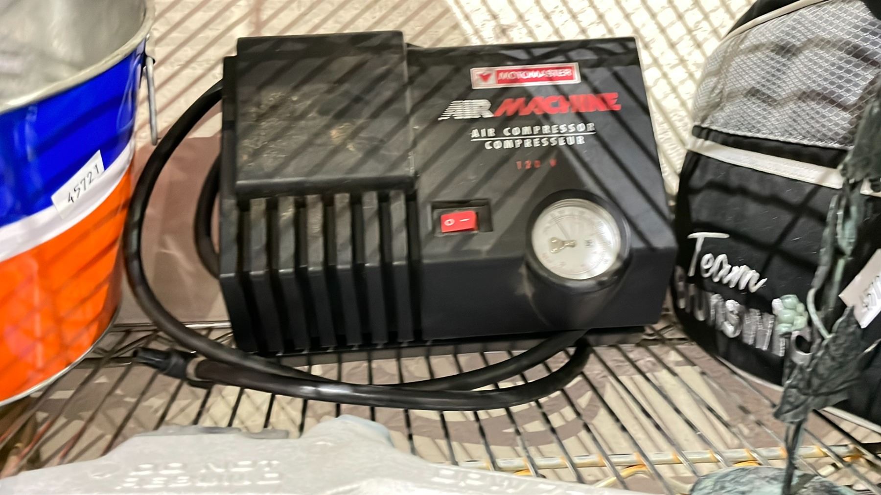 SHELF LOT OF ASSORTED ITEMS INCLUDING; MOTOMASTER AIR MACHINE AIR COMPRESSOR, BOWLING BAG WITH SHOES AND BOWLING BALLS AND MORE