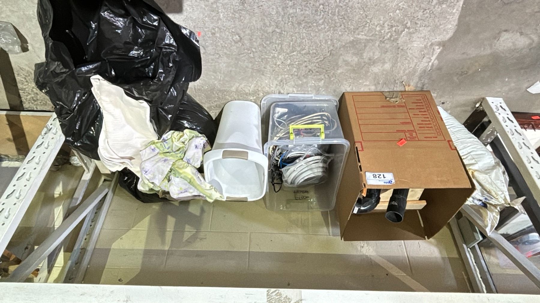 SHELF LOT OF ASSORTED ITEMS INCLUDING; PLASTIC PIPES, WOOD, ASSORTED CORDS, WEATHER STRIPING AND