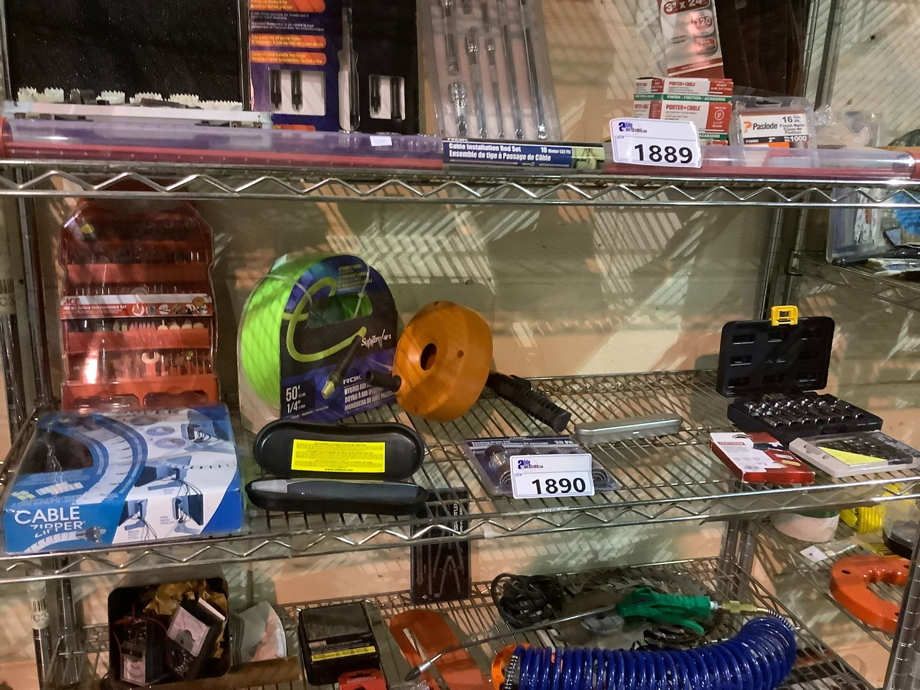 SHELF LOT OF ASSORTED ITEMS INCLUDING ROK HYBRID AIR HOSE 50', COLDHEAT SOLDERING PEN, CRAFTSMAN 10