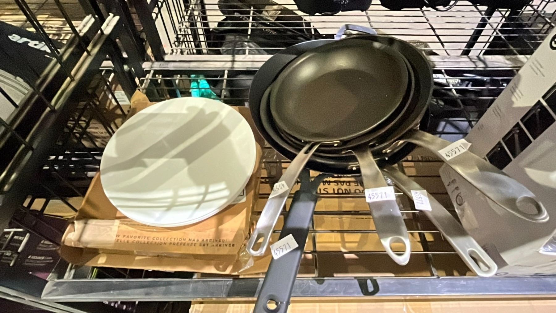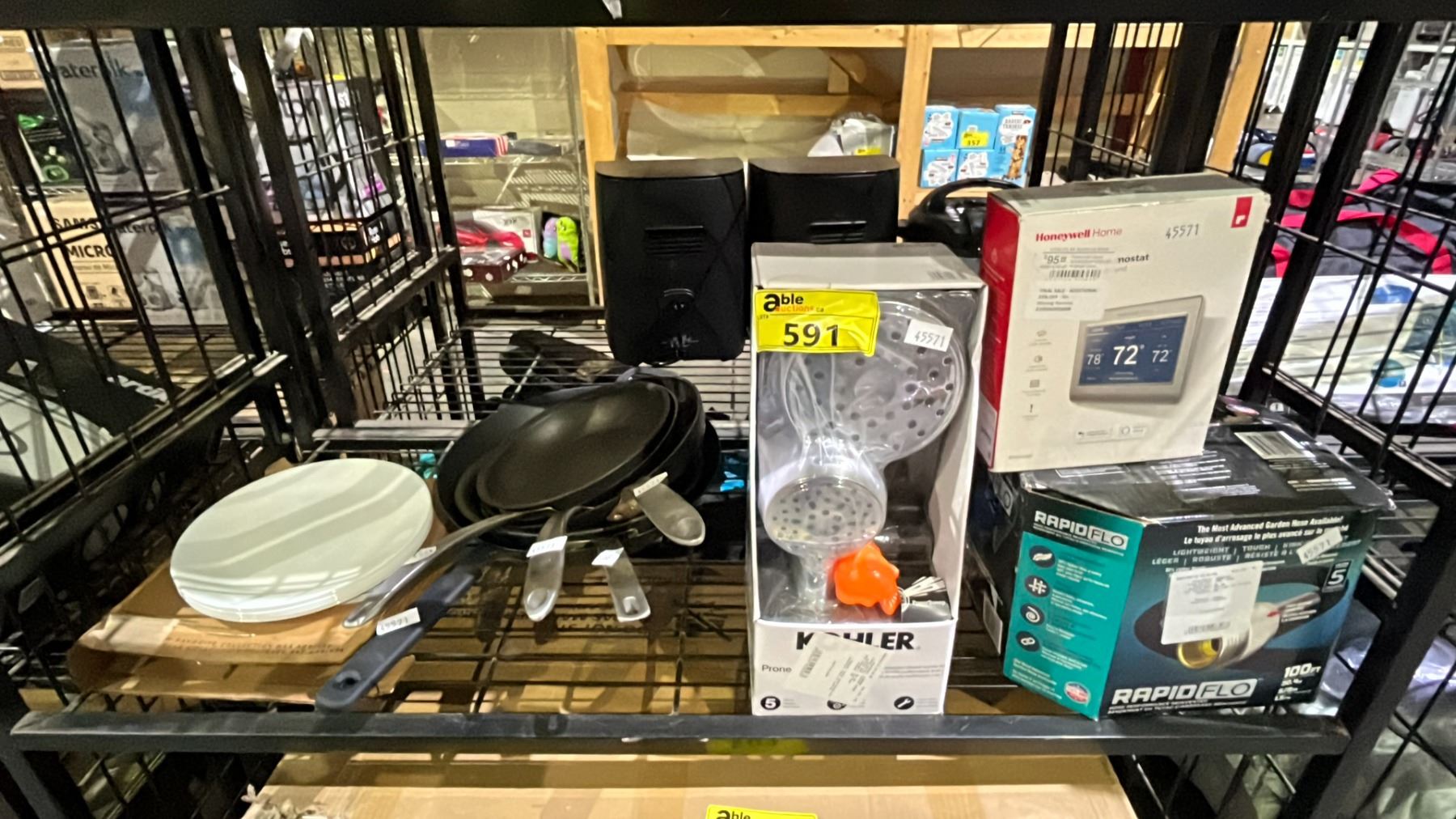 SHELF LOT OF ASSORTED ITEMS INCLUDING; SHOWER HEAD (MAY BE MISSING PIECES), RAPID FLO HOSE, PANS AND MORE