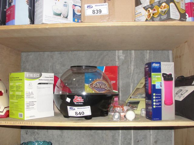 SHELF LOT OF ASSORTED ITEMS; IRON MAN MASK, POPCORN MAKER, SPORT BOTTLE, ETC