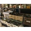 SHELF LOT OF ASSORTED JARS, BOTTLES, TOOLS & MORE