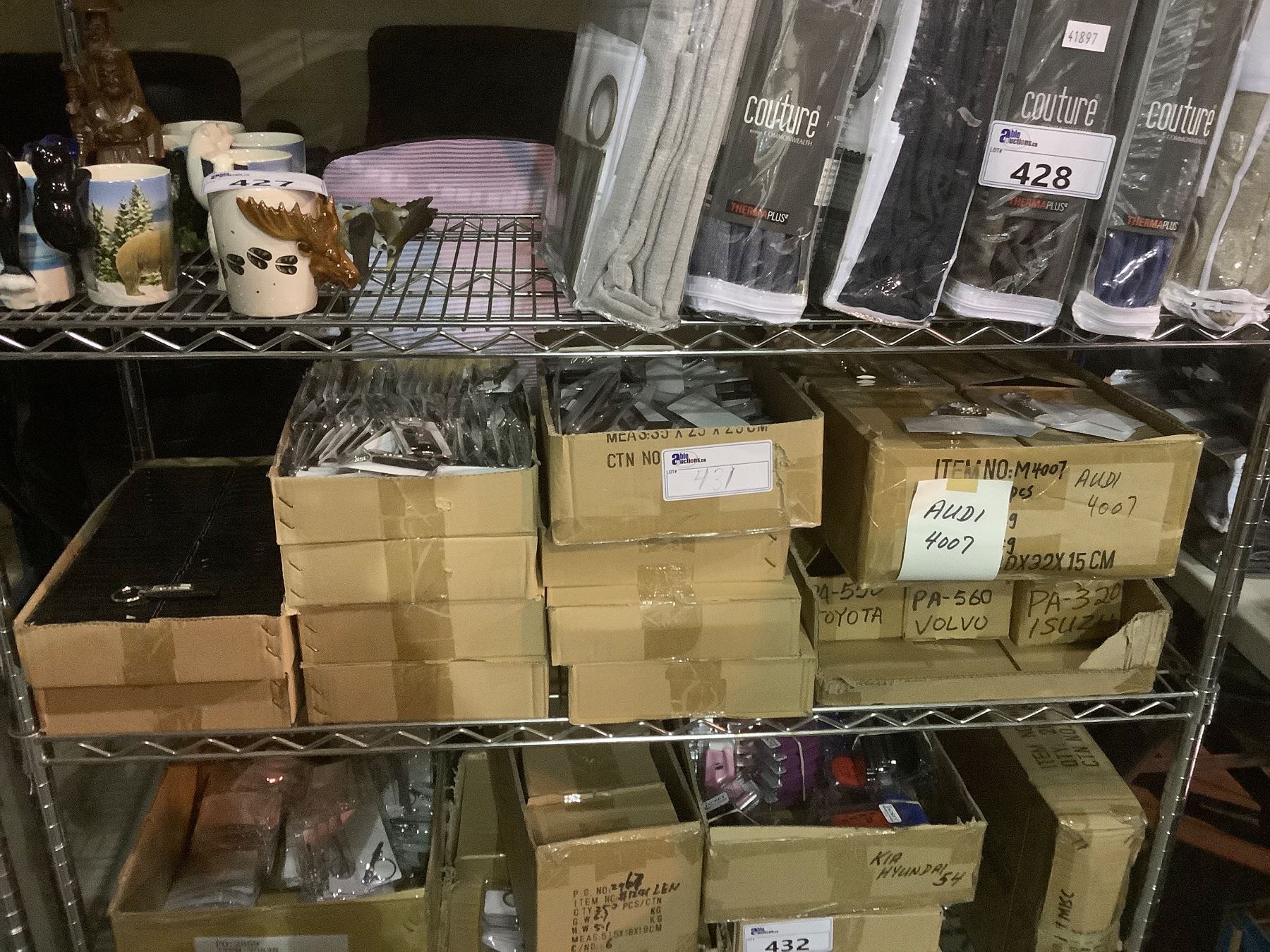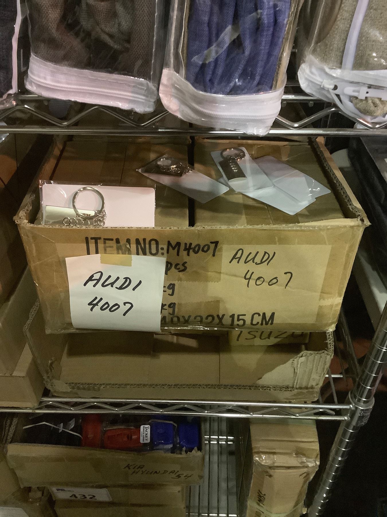 SHELF LOT OF ASSORTED KEYCHAINS AUDI, GMC EXECUTIVE, JEEP EXECUTIVE, AND MORE