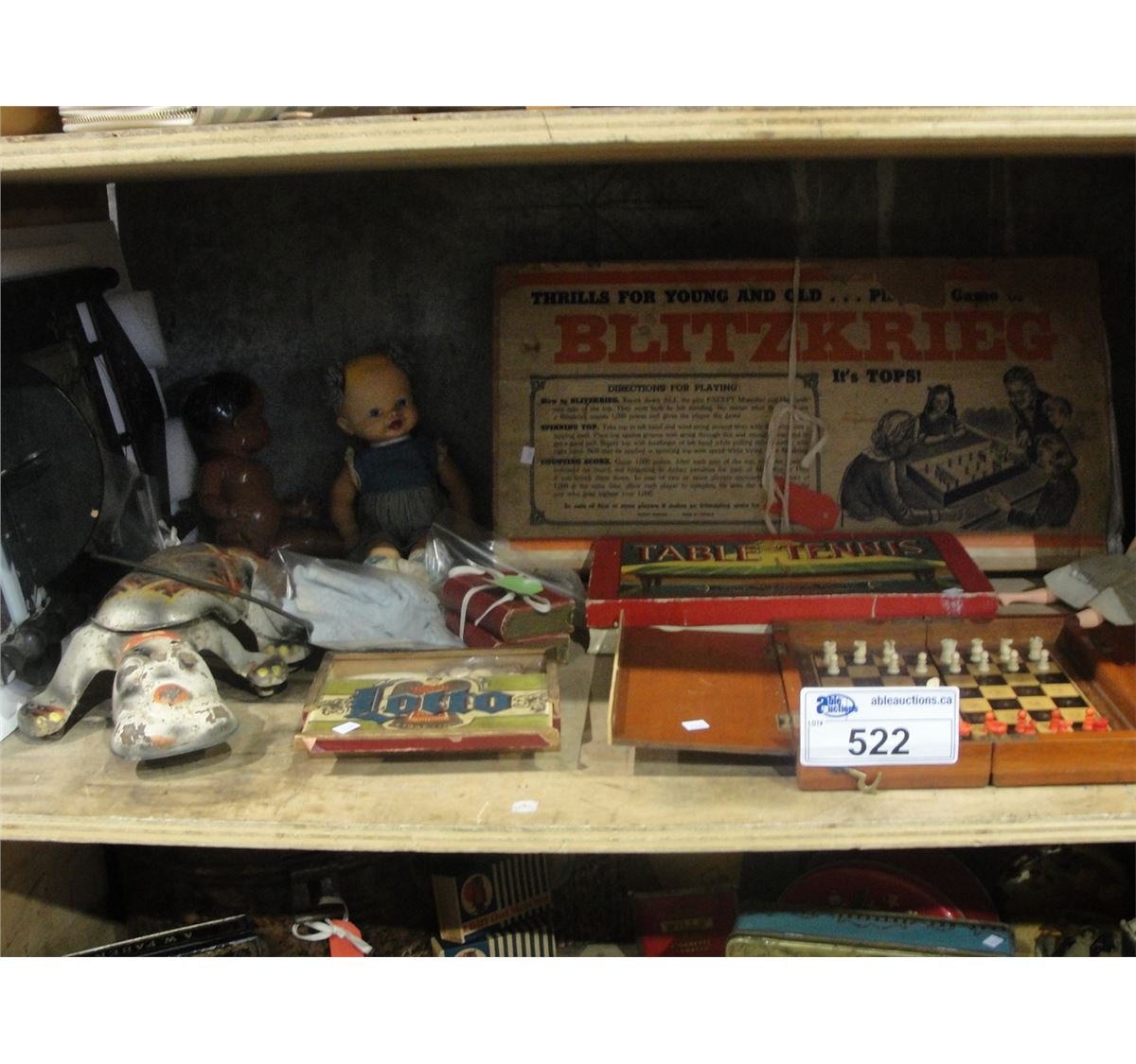 SHELF LOT OF ASSORTED KIDS VINTAGE GAMES AND TOYS