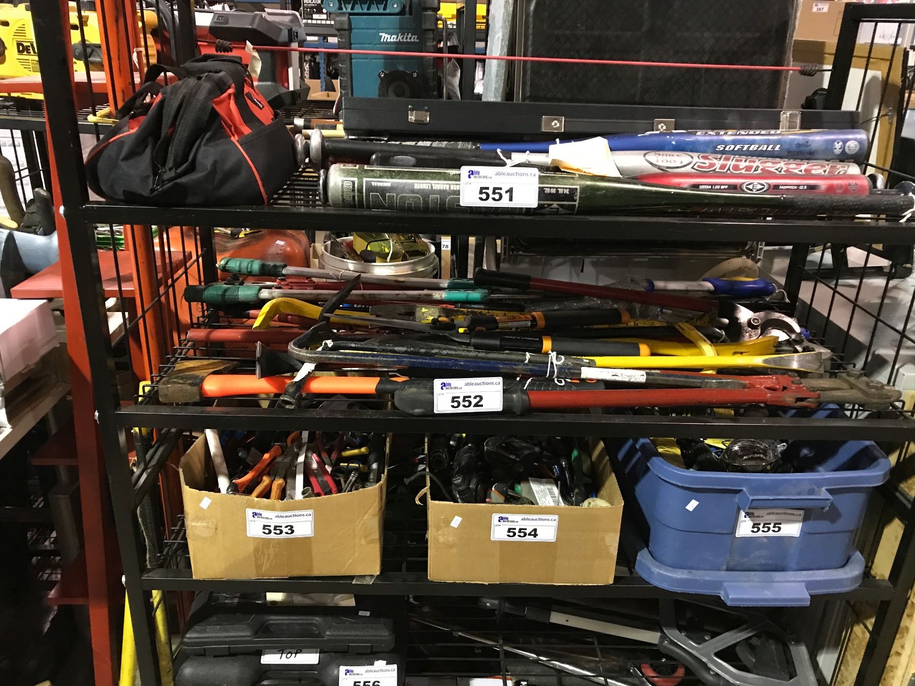 SHELF LOT OF ASSORTED LARGE HAND TOOLS