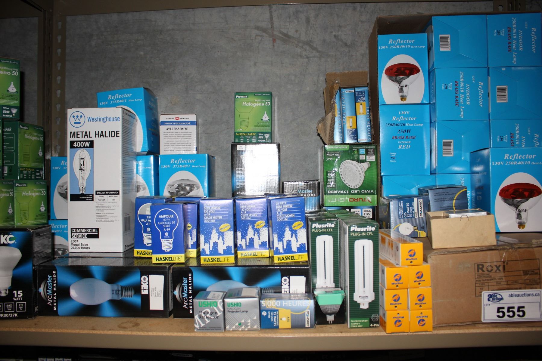 SHELF LOT OF ASSORTED LIGHTBULBS AND MORE