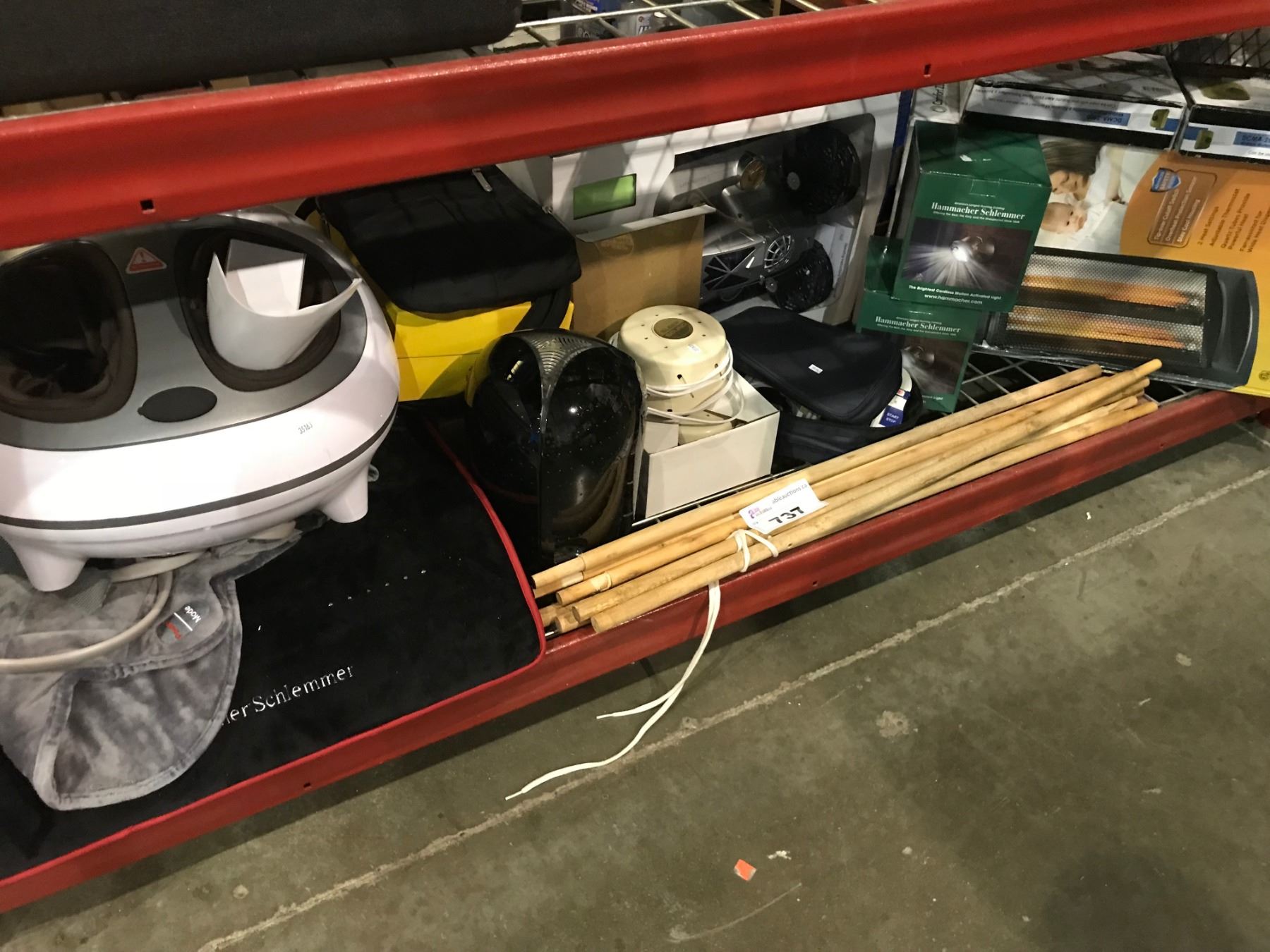 SHELF LOT OF ASSORTED MASSAGERS, LIGHTS, HEATER & MORE
