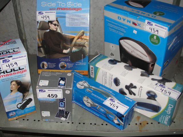 SHELF LOT OF ASSORTED MASSAGERS, PAPER SHREDDER, AND CORDLESS PHONE