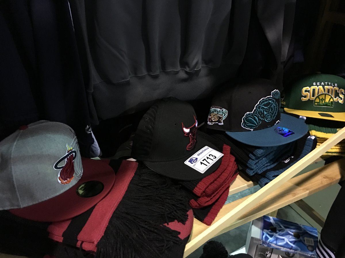 SHELF LOT OF ASSORTED MBA TEAM TOUQES & BALL CAPS HEAT BULLS GRIZZLIES SONICS