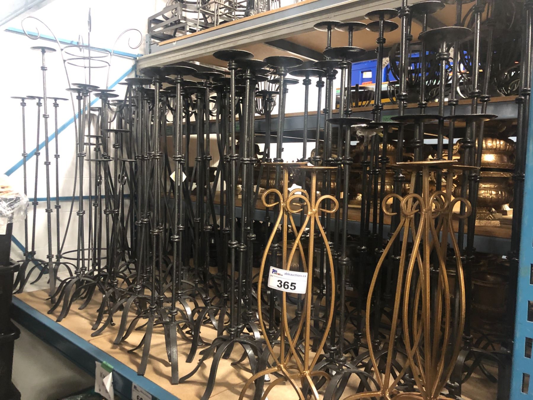 SHELF LOT OF ASSORTED METAL FLOOR STANDING CANDLE HOLDERS, VARIOUS HEIGHTS, COLOURS AND STYLES