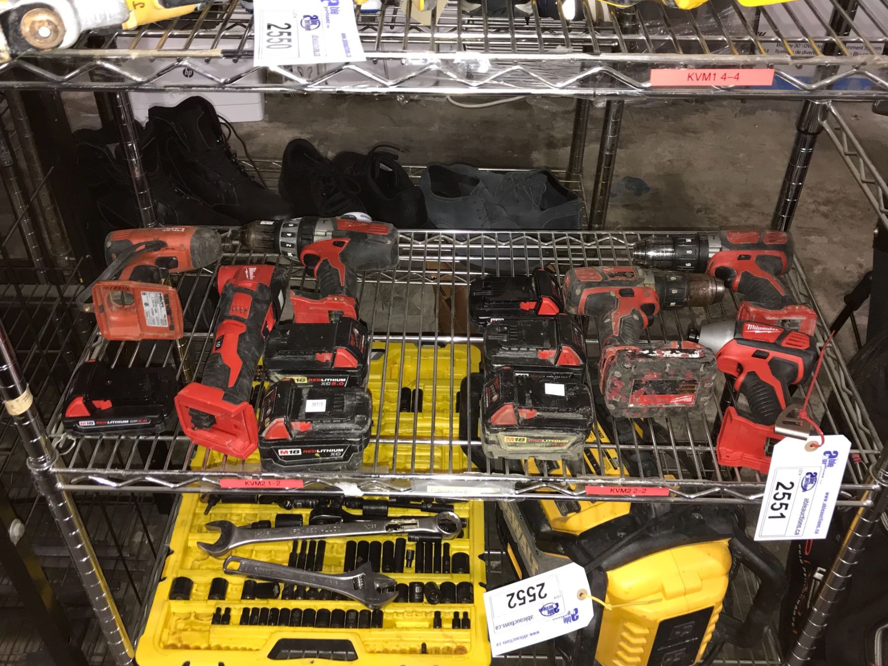 SHELF LOT OF ASSORTED MILWAUKEE TOOLS, DRILLS, IMPACT, AND MORE