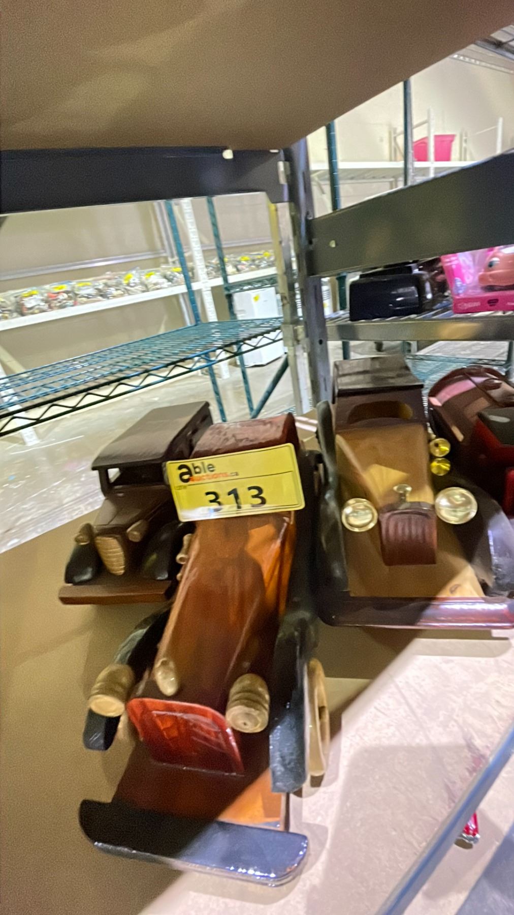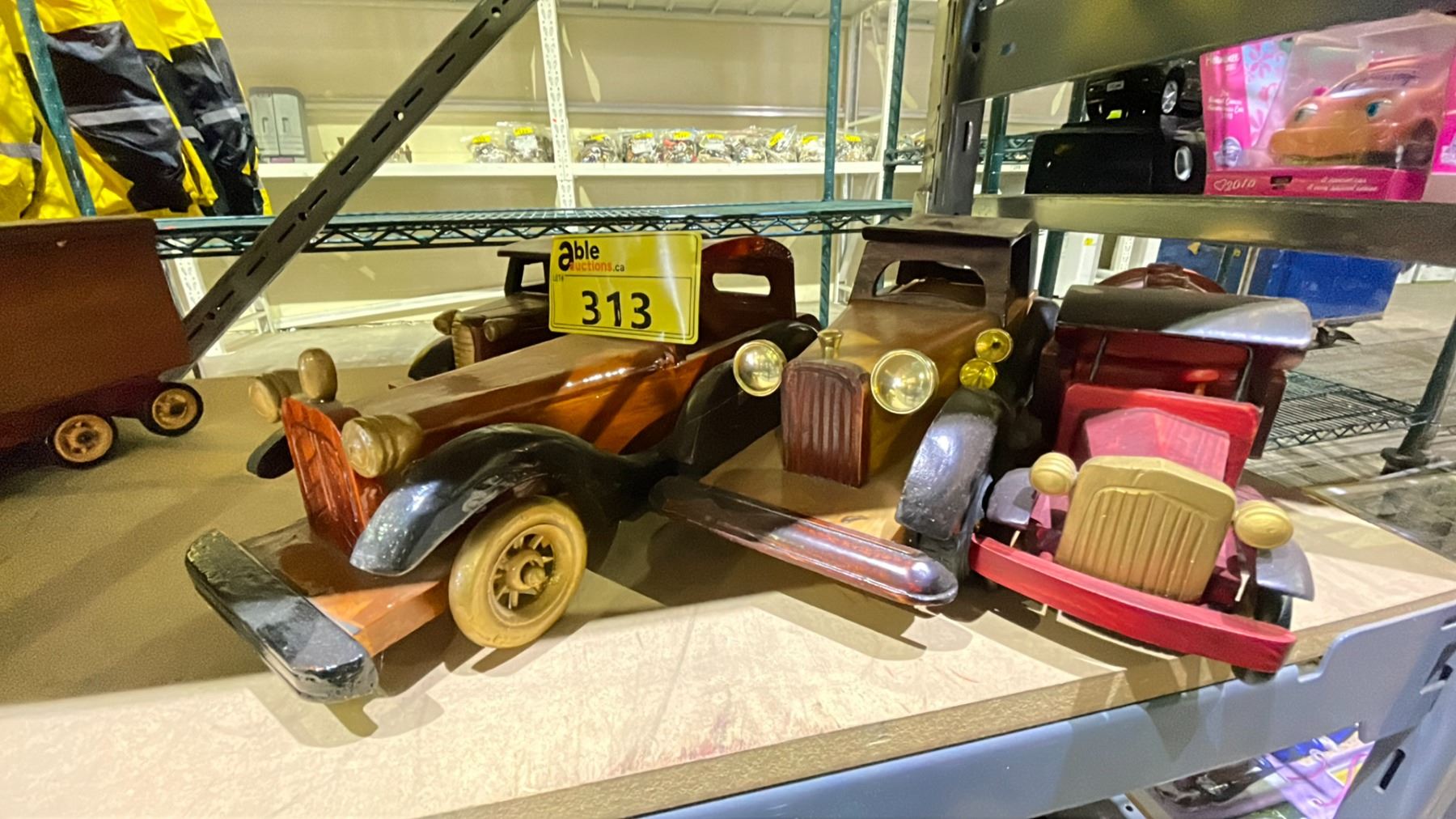 SHELF LOT OF ASSORTED MODEL WOODEN CARS