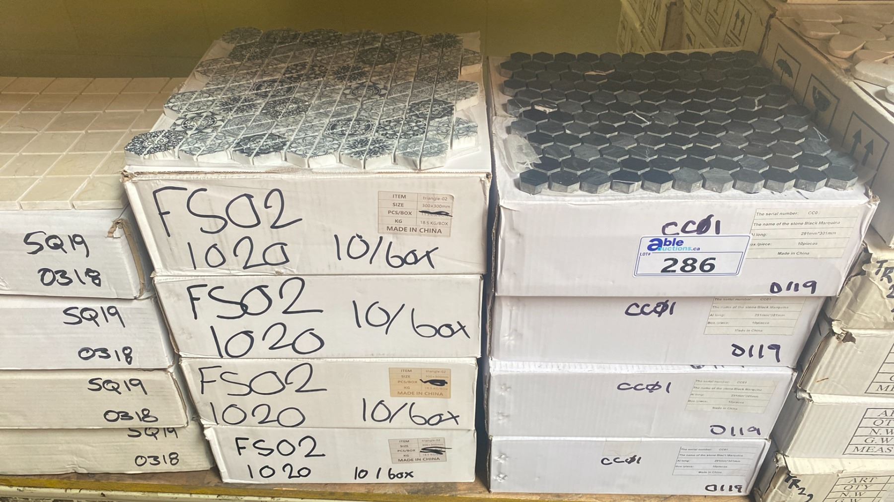 SHELF LOT OF ASSORTED MOSAIC TILE; 3 BOXES CYN1, 6 BOXES BASMIXED, 23 BOXES TR221, 4 BOXES CC01, 4 BOXES, 4 BOXES FS02, 4 BOXES SQ19, 1 BOX ASSORTED