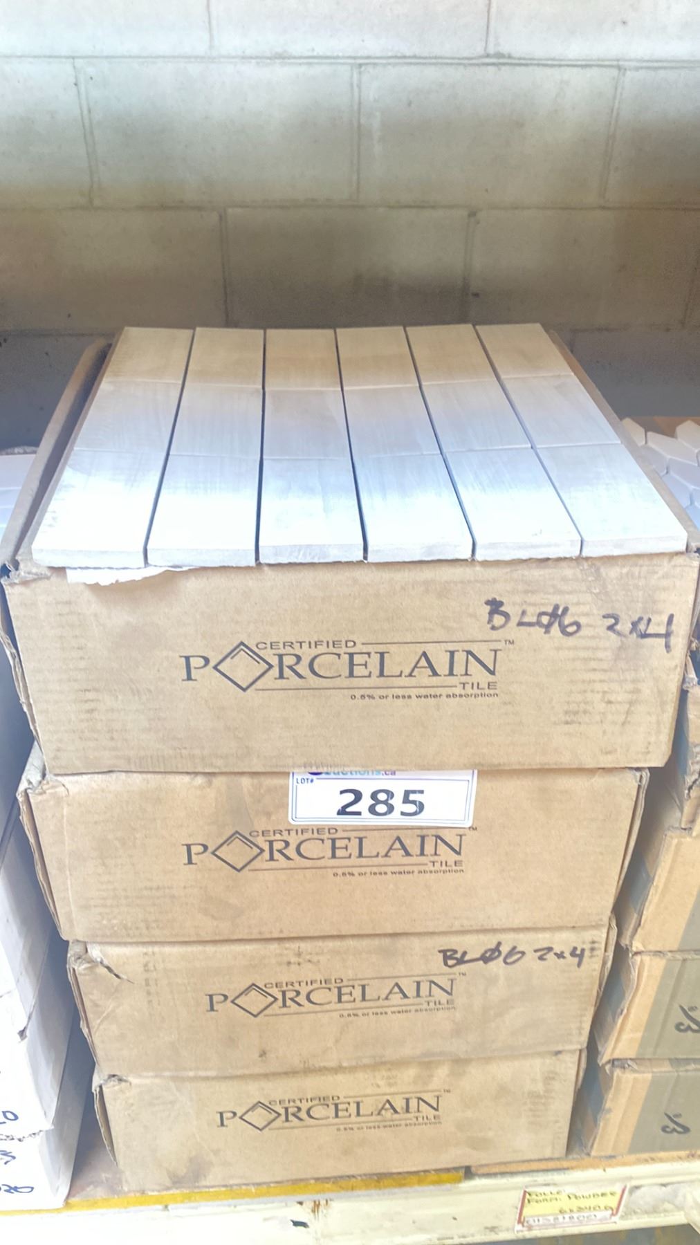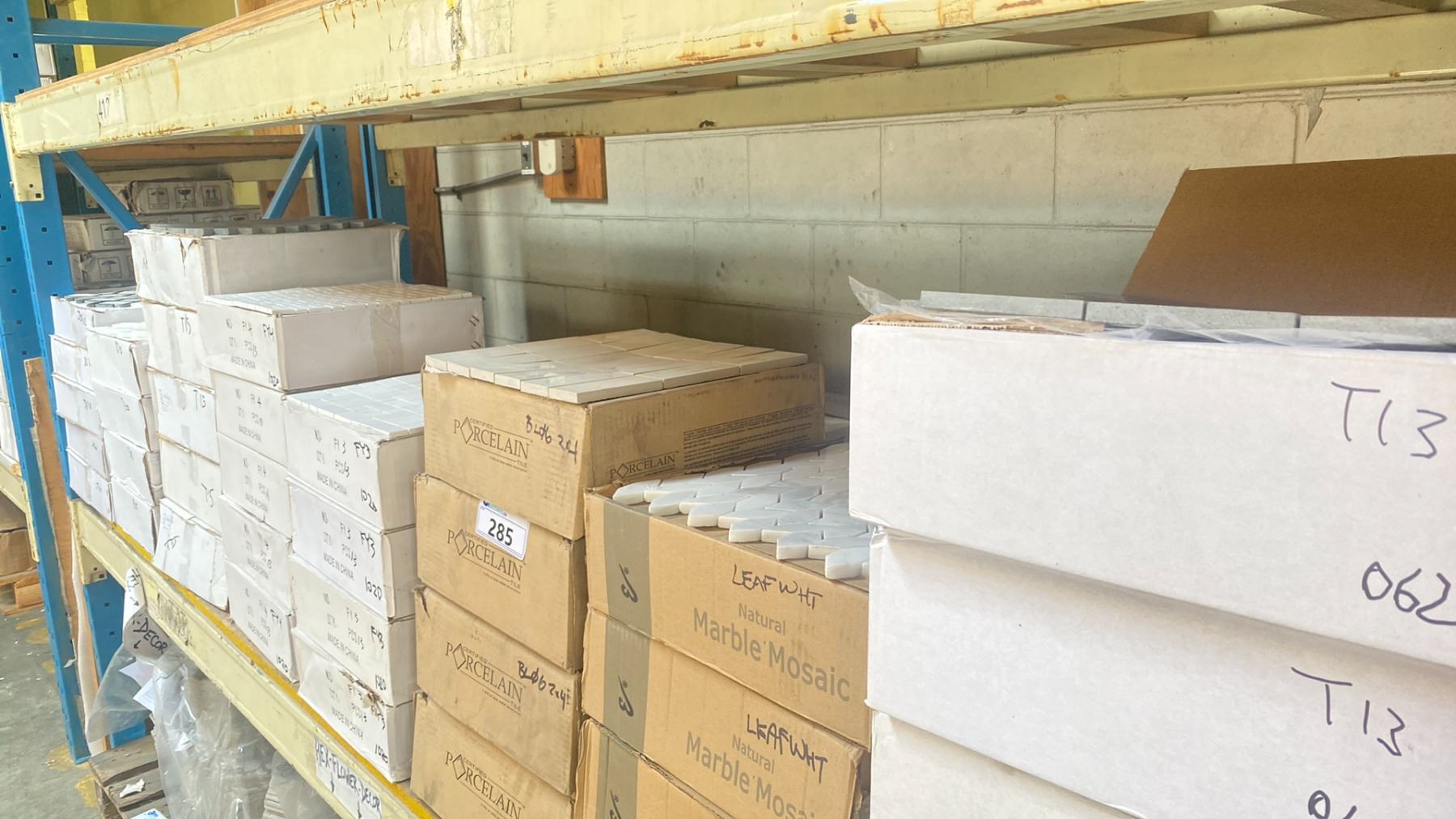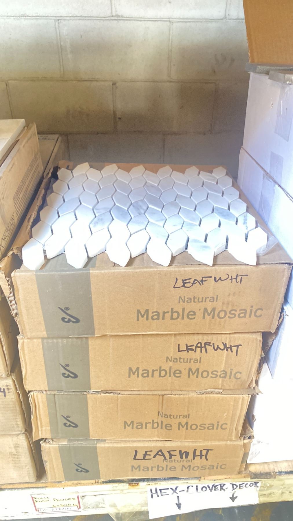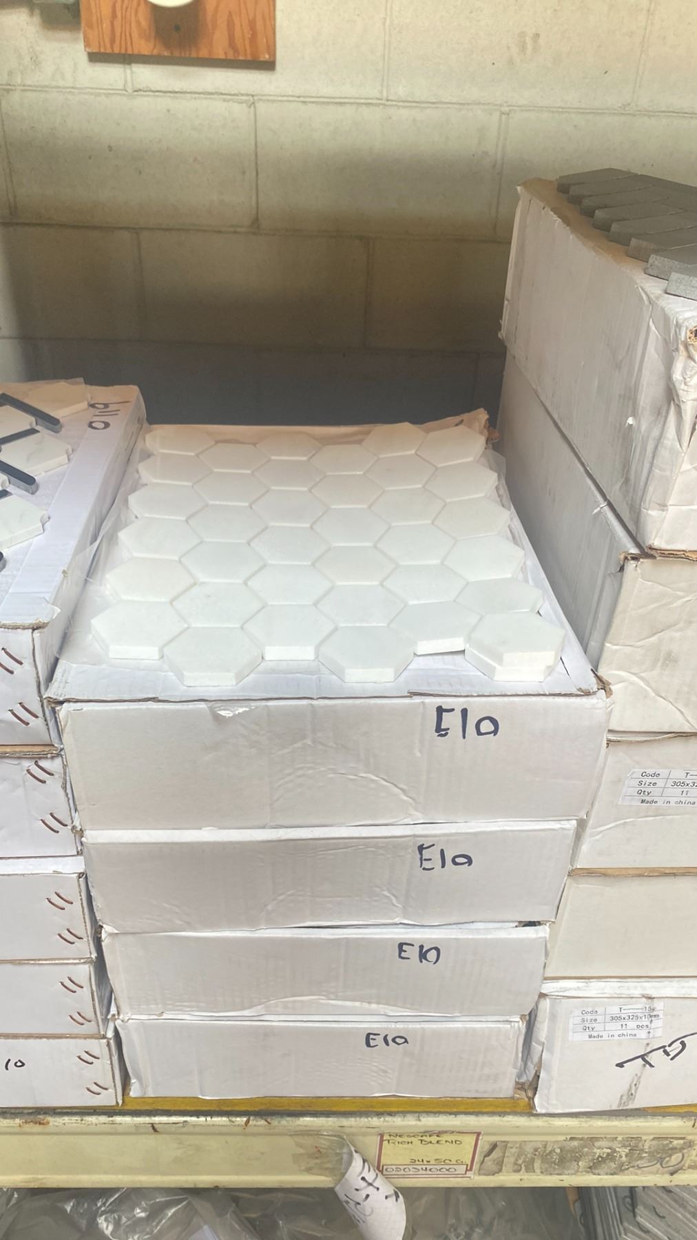 SHELF LOT OF ASSORTED MOSAIC TILES; 5 BOXES T13, 4 BOXES MARBLE LEAF WHITE, 7 BOXES CERTIFIED PORCELAIN BL06, 4 BOXES FY3, 4 BOXES FY4, 5 BOXES T15, 4 BOXES E10 & 5 BOXES JS10