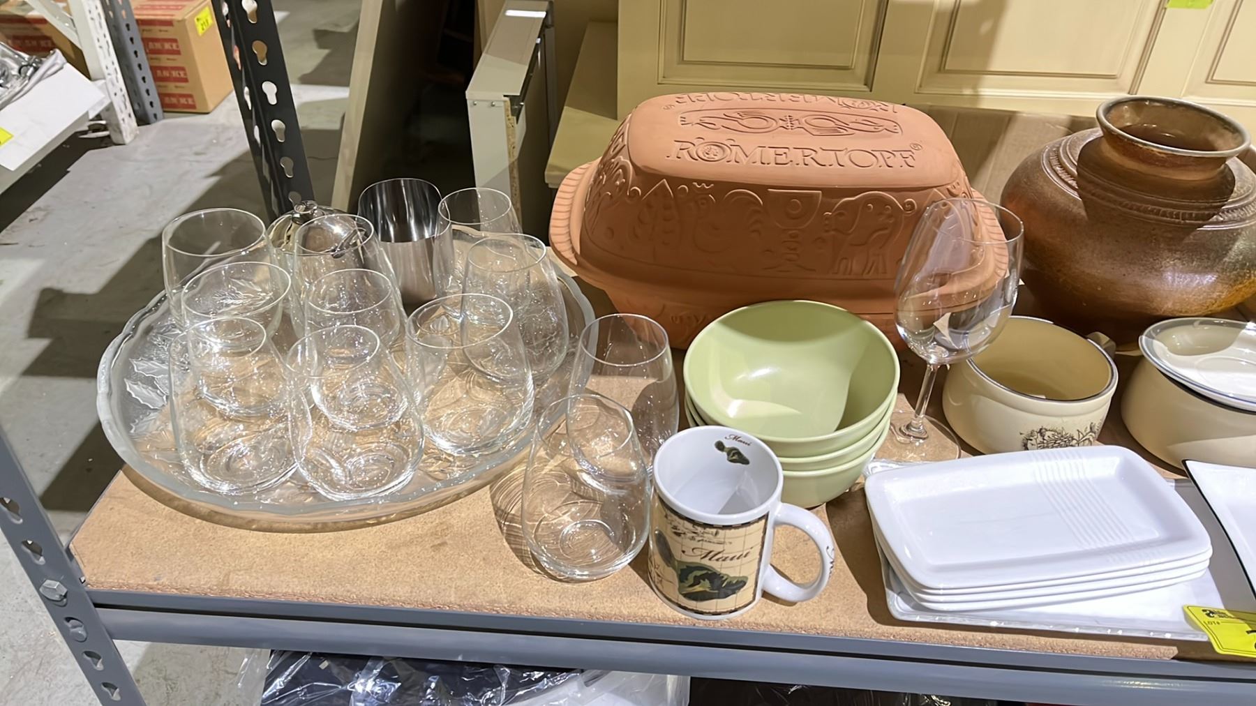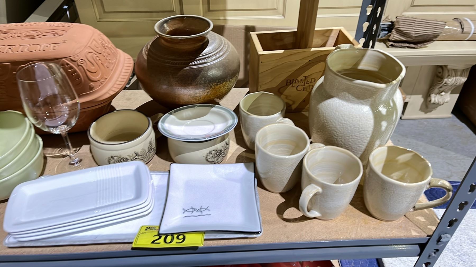 SHELF LOT OF ASSORTED MUGS, SERVING TRAY, GLASSES AND MORE