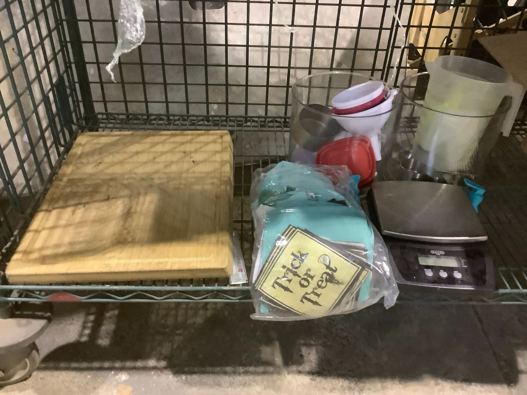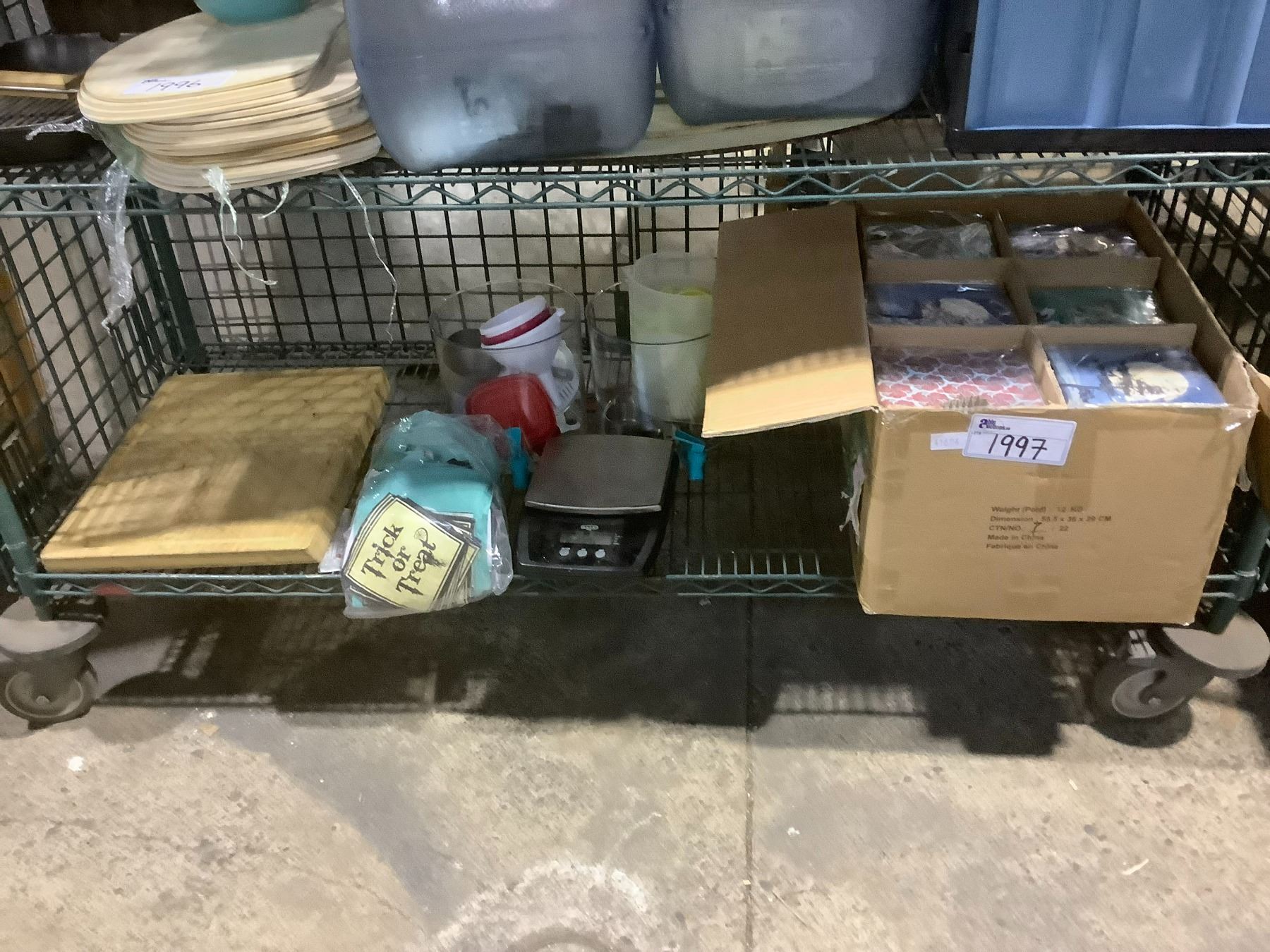 SHELF LOT OF ASSORTED NAPKINS, SCALE, CUTTING BOARDS, AND MORE