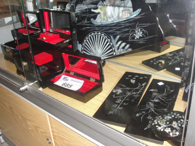 SHELF LOT OF ASSORTED ORIENTAL BLACK LAQUER PIECES; FANS, JEWELLERY BOXES, BOWLS ETC