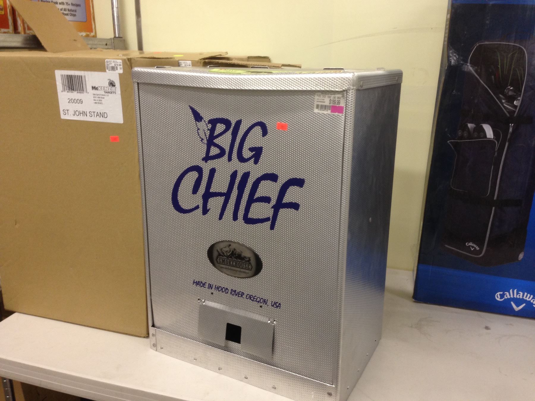 SHELF LOT OF ASSORTED OUTDOOR SPORTING GOODS STORE INVENTORY- SMOKER, ST. JOHN TARGET STANDS, AND GOLF BAG