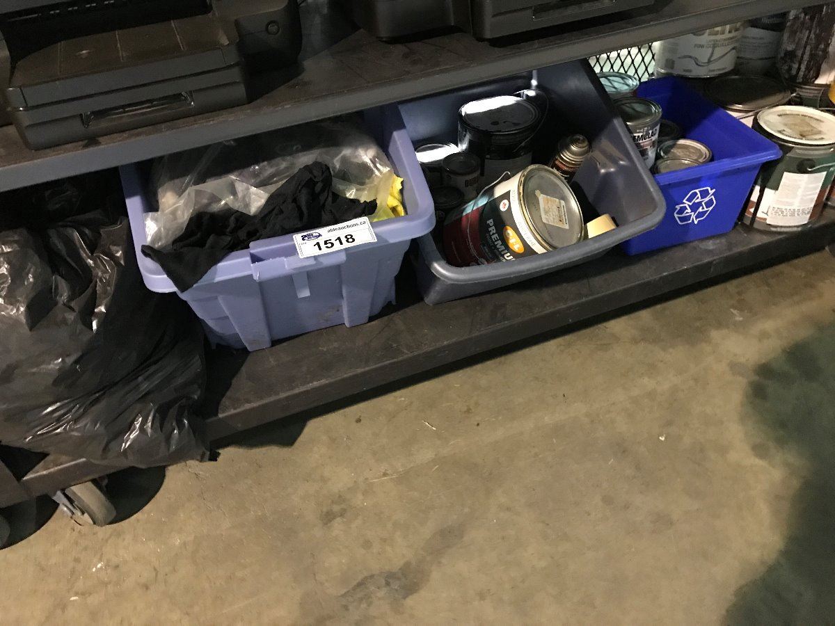 SHELF LOT OF ASSORTED PAINT, RAGS & MORE