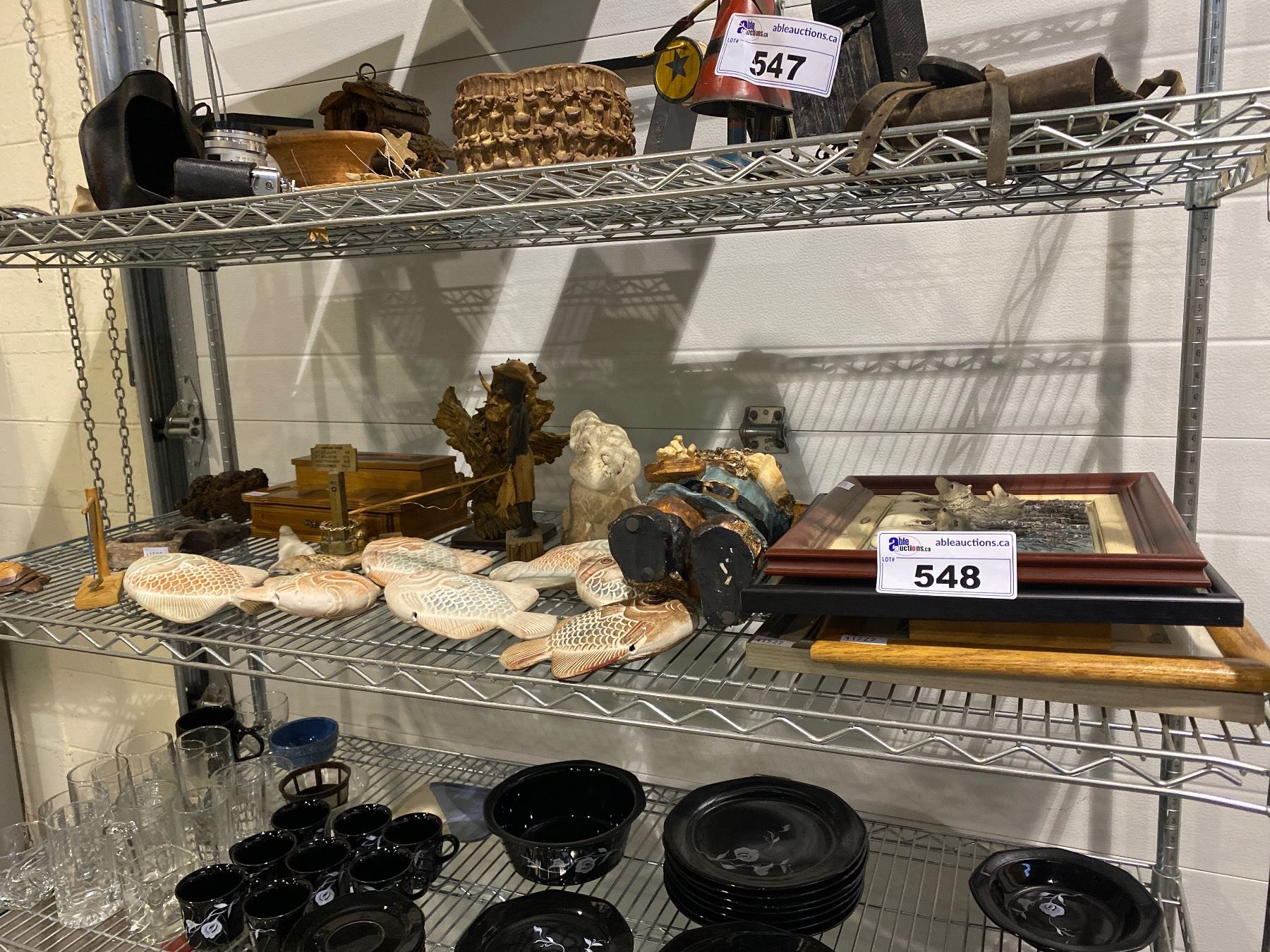SHELF LOT OF ASSORTED PICTURES, ORNAMENTS, AND MORE