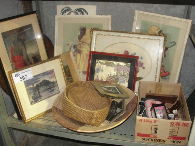 SHELF LOT OF ASSORTED PICTURES, PRINTS AND ORIGINAL ART, WOVEN BASKETS AND BOX OF COLLECTABLE CHINA FIGURINES
