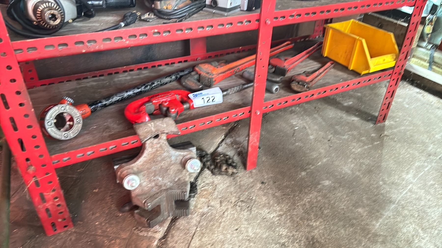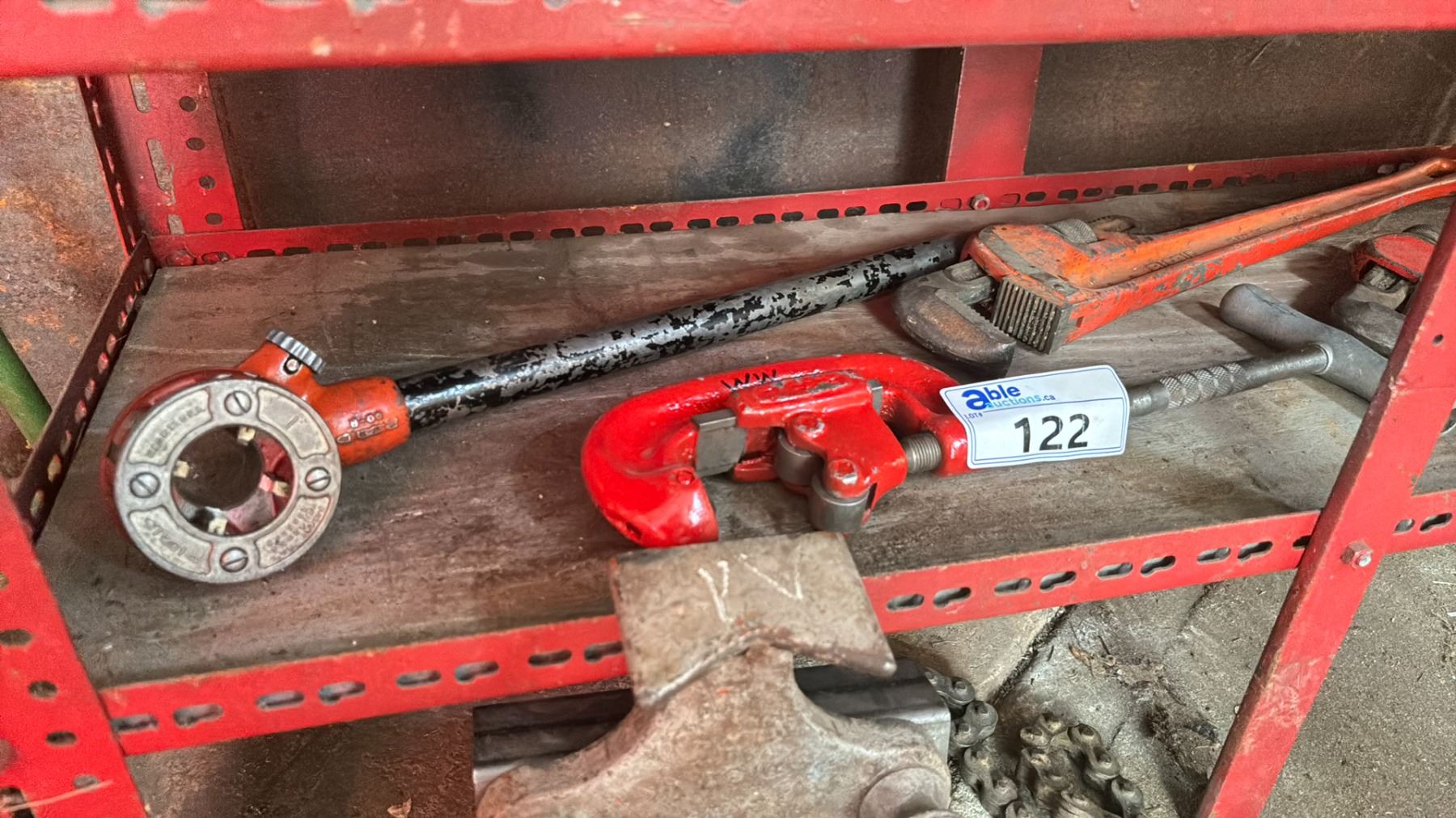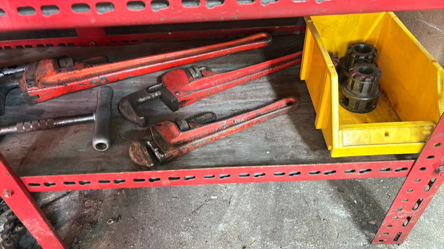 SHELF LOT OF ASSORTED PIPE FITTING TOOLS - RIDGID THREADER, 3 PIPE WRENCHES & PIPE CUTTER