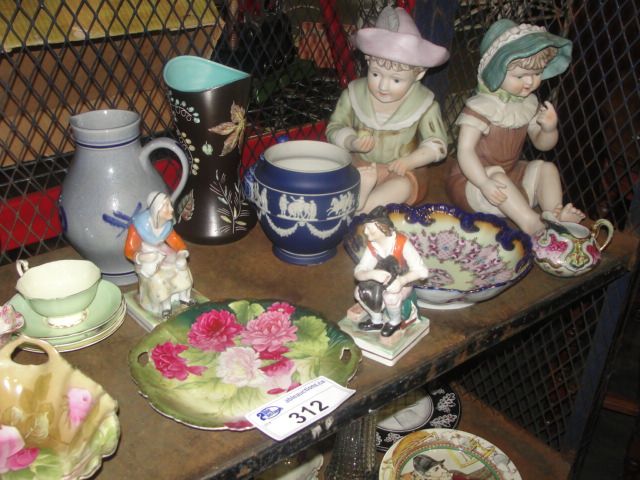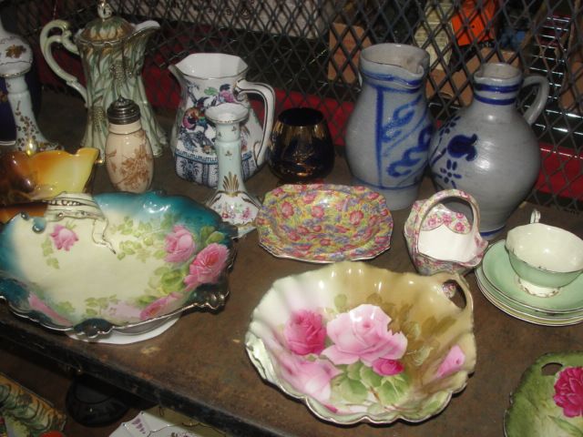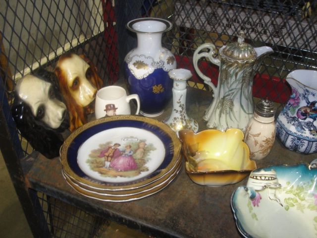 SHELF LOT OF ASSORTED PORCELAIN AND CERAMICS; BOWLS, VASES, JUGS, ETC