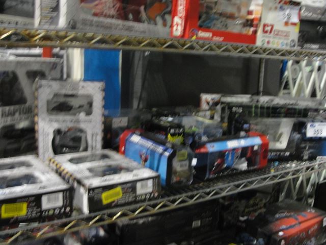SHELF LOT OF ASSORTED RADIO CONTROLLED TOYS; HELICOPTERS, CARS, ETC
