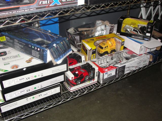 SHELF LOT OF ASSORTED RADIO CONTROLLED TOYS; HELICOPTERS, CARS, ETC