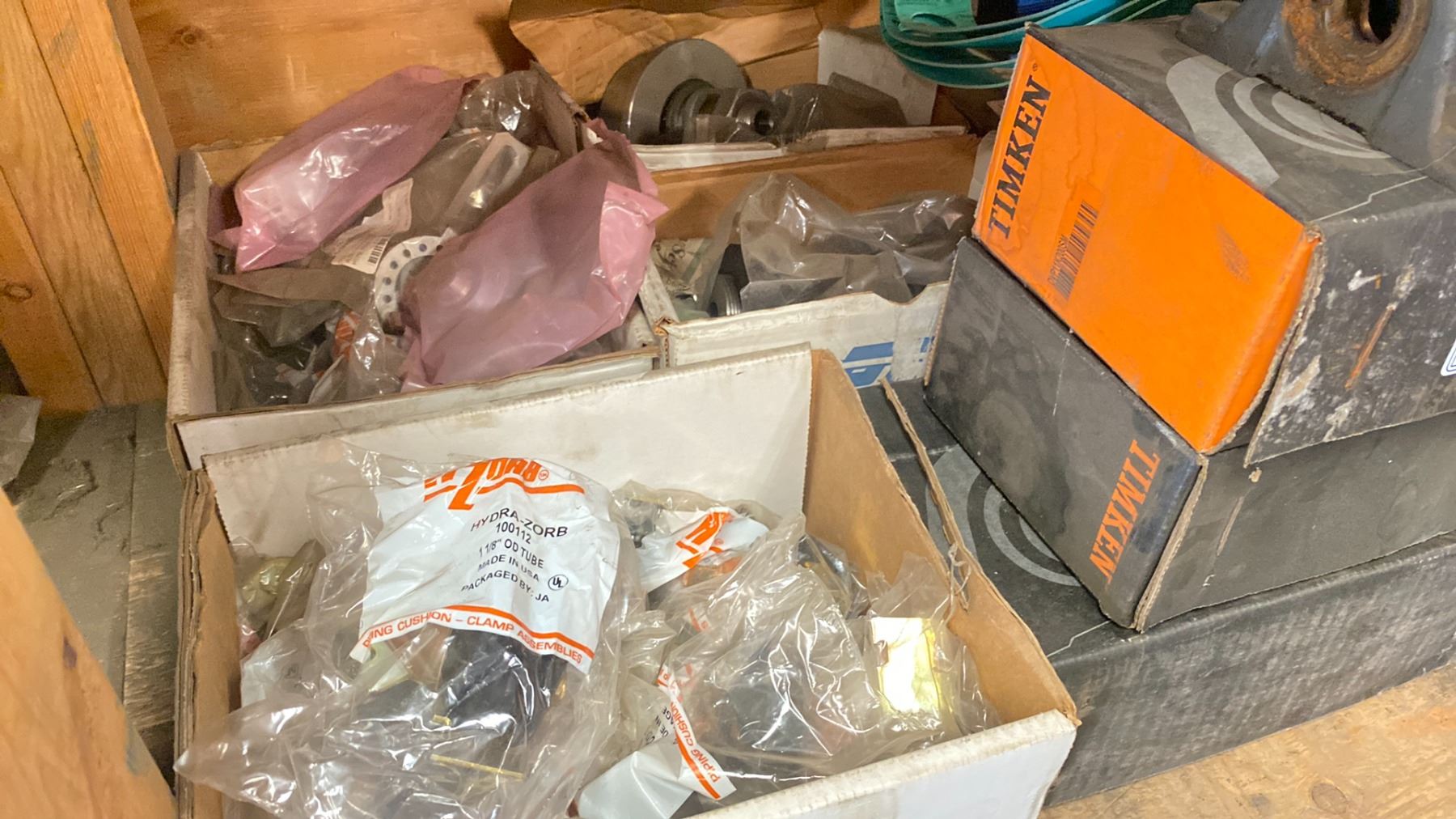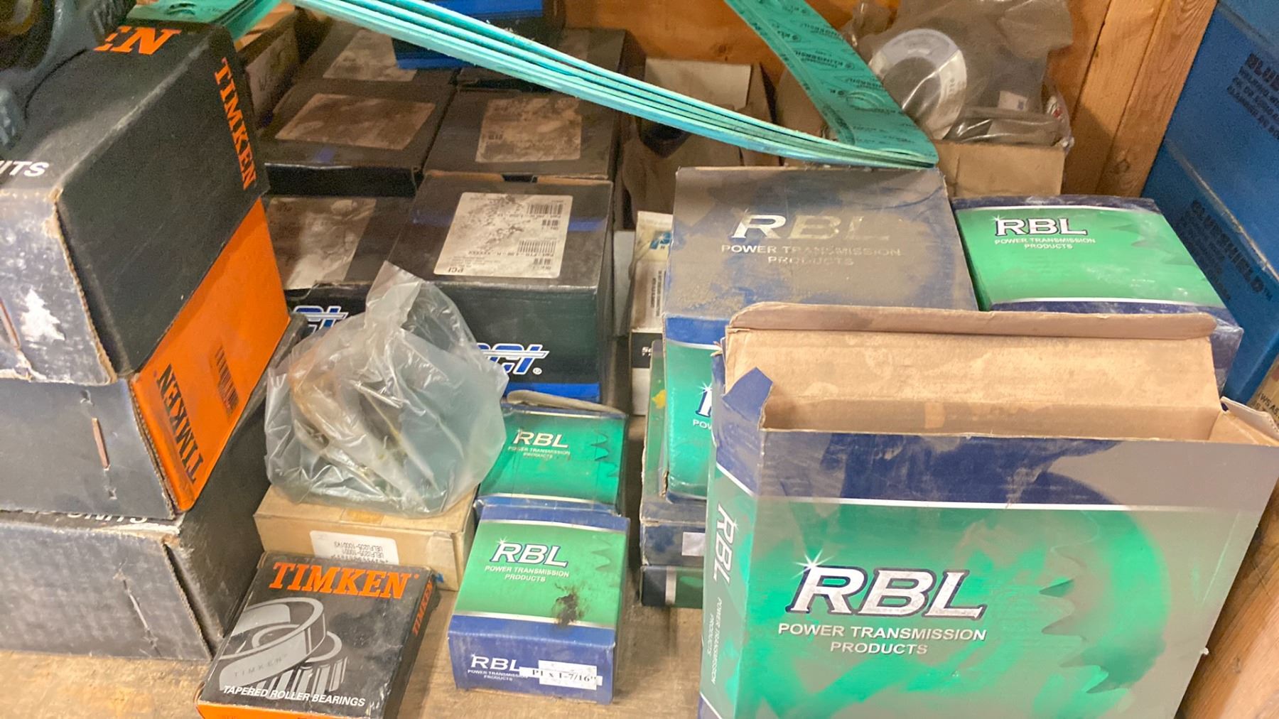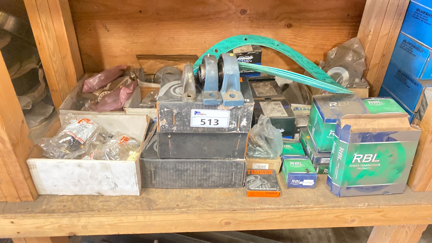 SHELF LOT OF ASSORTED RBL POWER TRANSMISSION PRODUCTS, BLOCK BEARINGS & ASSORTED HARDWARE