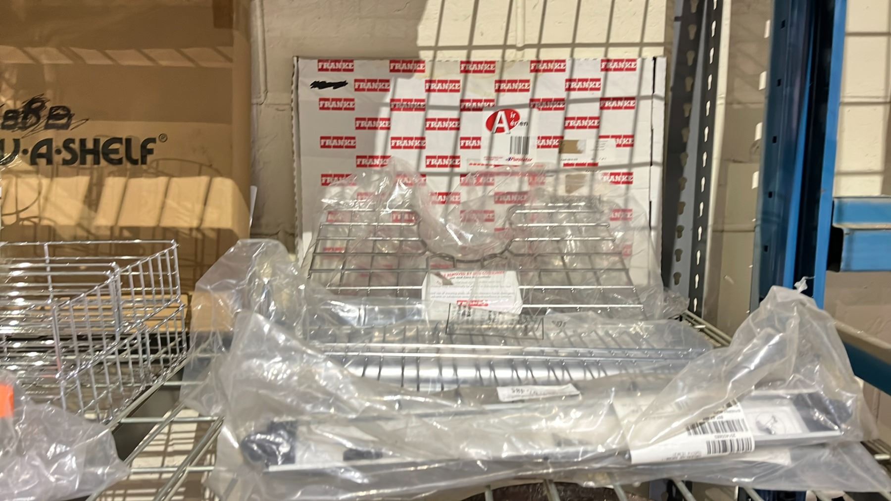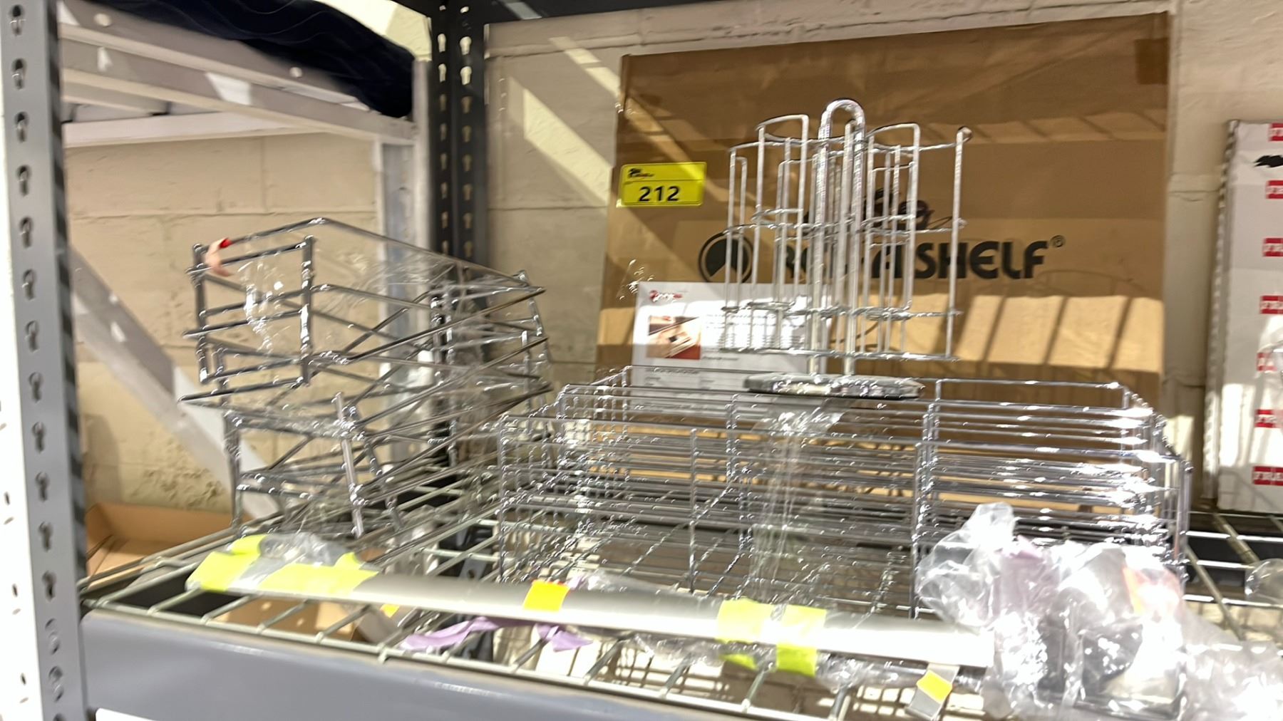 SHELF LOT OF ASSORTED RICHELLEU WOOD KNIFE BLOCK DRAWER INSERT AND ASSORTED CHROME FINISH STORAGE RACKS, LADLE SET AND MORE